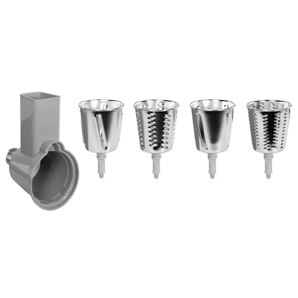 A safety grip makes the installation or removal of the drums easy and safe. This accessory will complete your stand mixer with excellent functionality.Features:Body accessory and food pusher in plastic materialLock/ unlock system in stainless steelSafety grip Easy and safe drum installation or removal 4 stainless steel drums for grating or slicingMedium slicerFine slicerCoarse graterFine grater Under 3 quarts13 x 14 x 6 inches