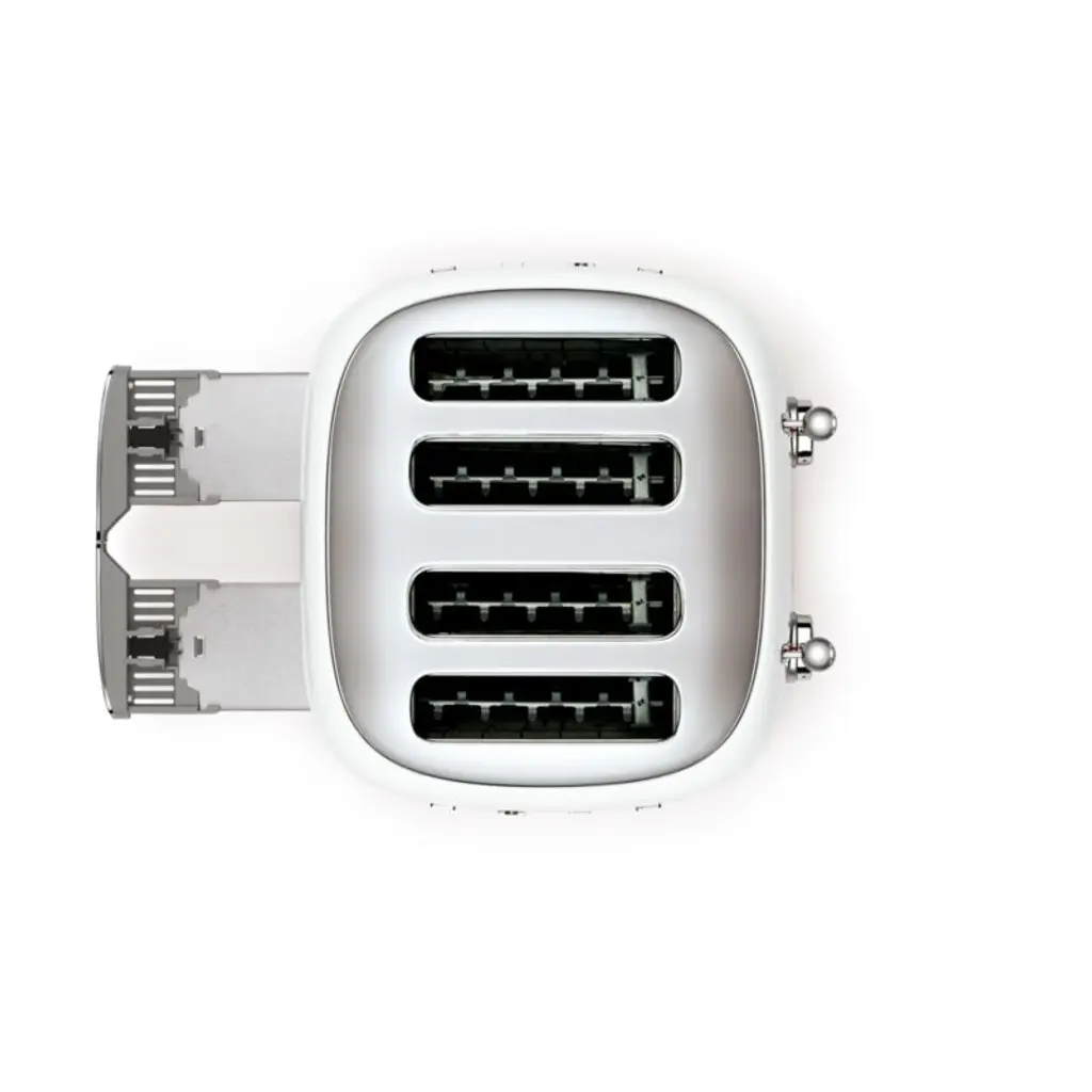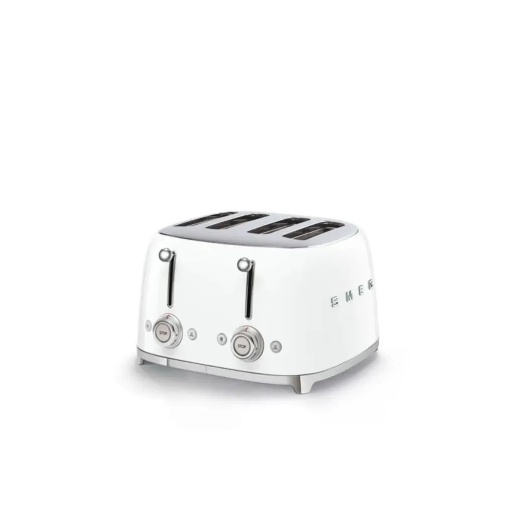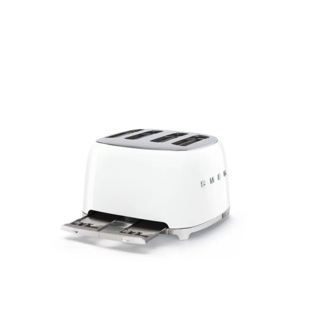 Enameled in bright, glossy white and accented with a charming ball lever knob, this retro four-slice toaster browns bread, bagels and more at six levels with three convenient pre-set programs. Two control panels ensure everyone's toast is done to their specifications. Four extra-wide slots accommodate different slice widths, and self-centering racks ensure even toasting.Known for its wonderfully retro refrigerators, SMEG has launched a joyfully designed retro kitchen appliance collection based on the curved and compact lines of postwar design. SMEG's nod to the past is the star of today's kitchen, incorporating all the current advances in technology.