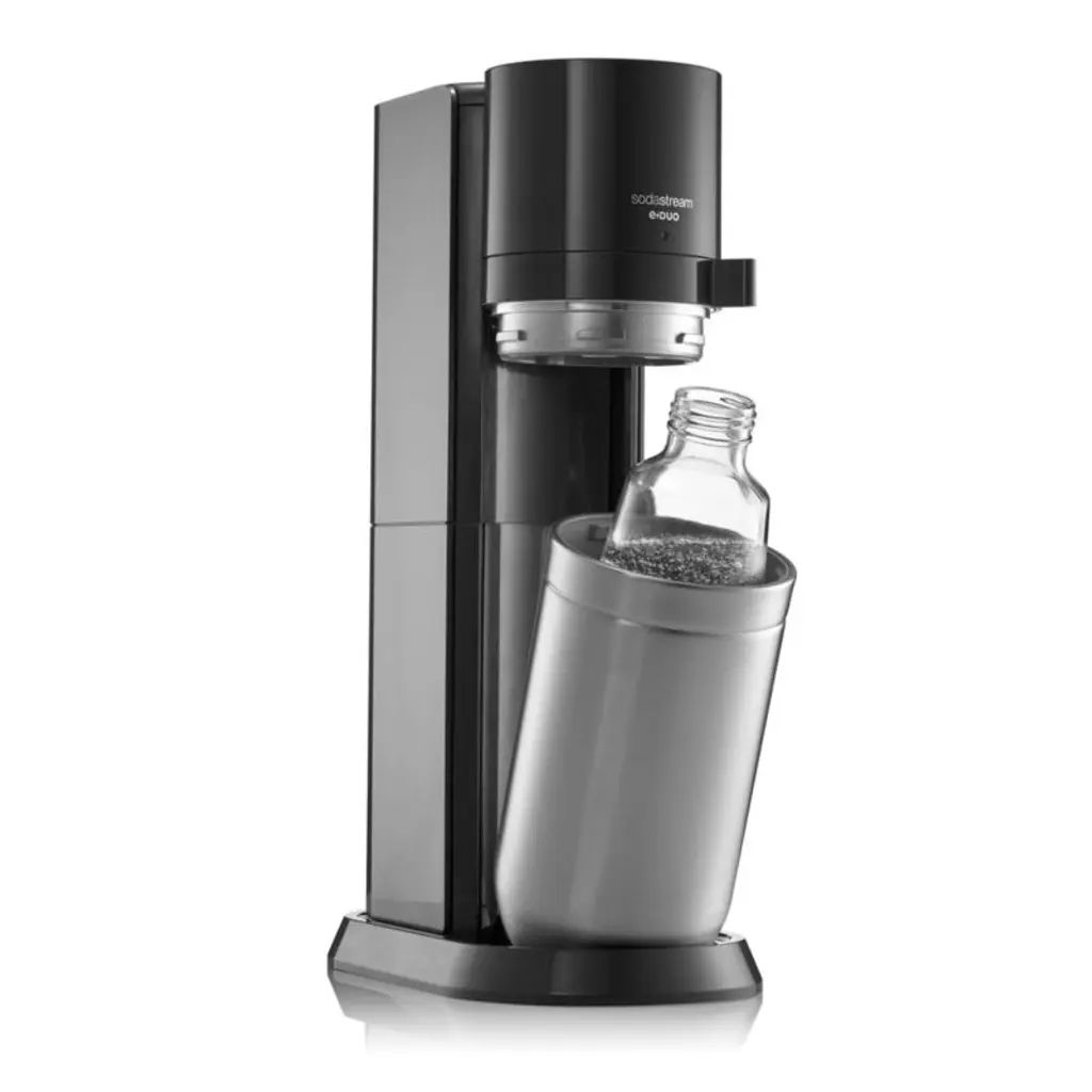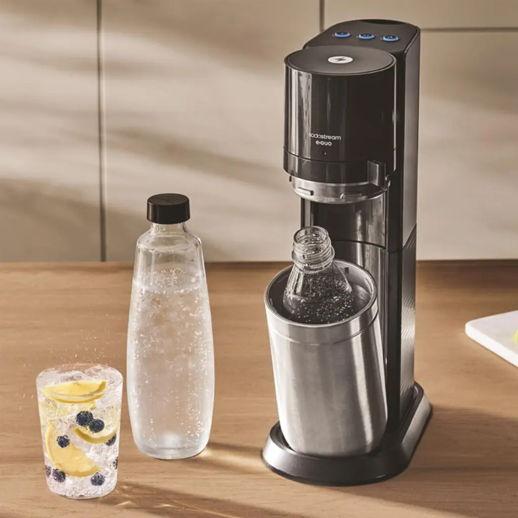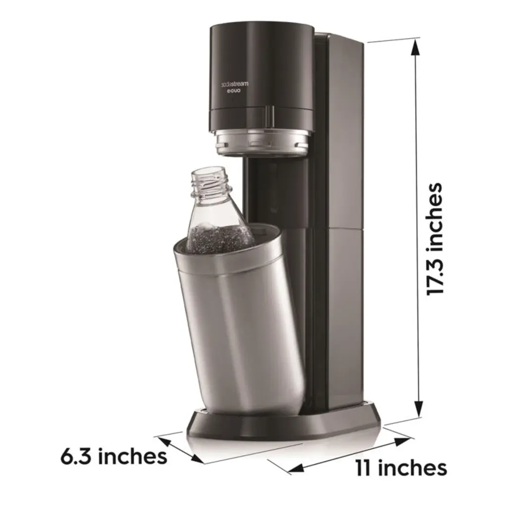 Create sparkling water with the press of a button. Finished in black, this slim sparkling water maker offers three carbonation levels with one-touch operation. The dual carbonation system lets you carbonate water in both the included glass and plastic bottlesone for home refreshment and the other for worry-free, on-the-go transport. Quick Connect technology secures the CO2 canister instantly into place, and the Snap & Lock features makes it easy to attach and release the reusable bottle. This sparkling water machine includes a carbonating gas cylinder and a one-liter bottle that looks attractive on the table and in the fridge.We now offer an in-store carbonator cylinder exchange program. Bring your empty CO2 cylinder to Crate & Barrel and exchange it for a replacement at a 50% discount. Empty cylinders are returned to the manufacturer for reuse.