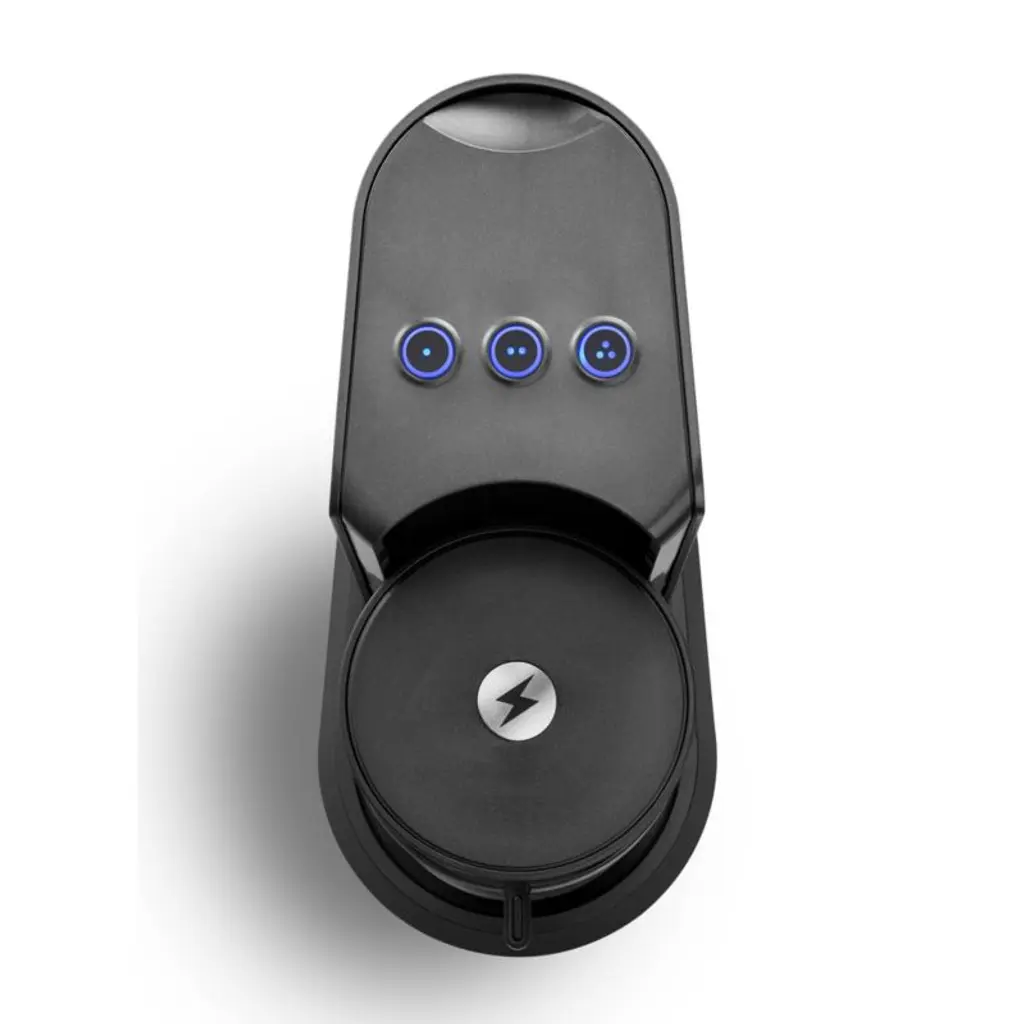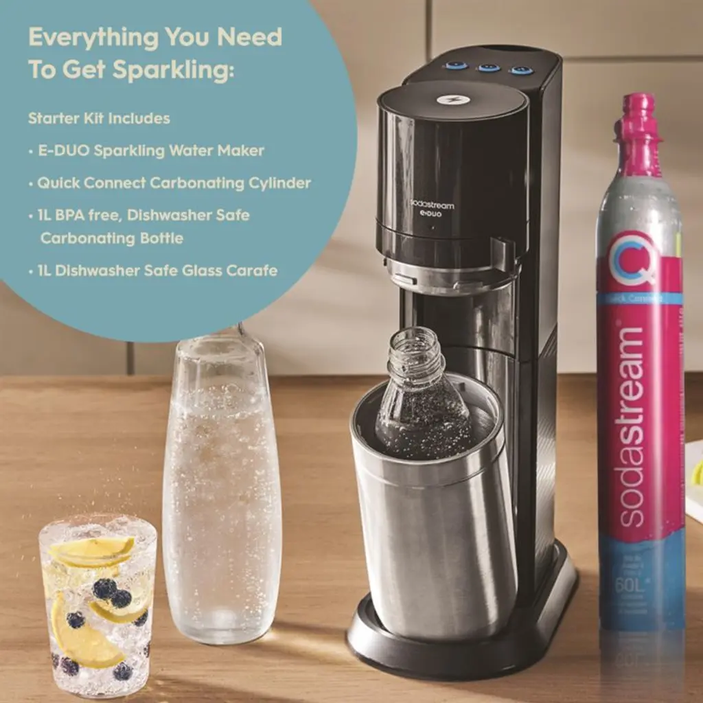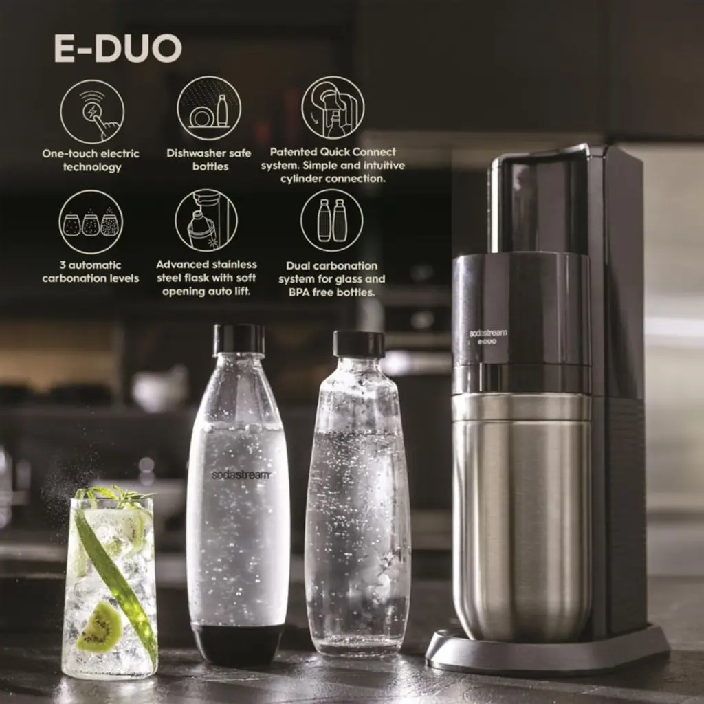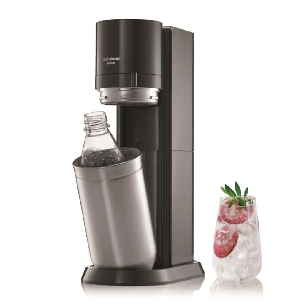 Create sparkling water with the press of a button. Finished in black, this slim sparkling water maker offers three carbonation levels with one-touch operation. The dual carbonation system lets you carbonate water in both the included glass and plastic bottlesone for home refreshment and the other for worry-free, on-the-go transport. Quick Connect technology secures the CO2 canister instantly into place, and the Snap & Lock features makes it easy to attach and release the reusable bottle. This sparkling water machine includes a carbonating gas cylinder and a one-liter bottle that looks attractive on the table and in the fridge.We now offer an in-store carbonator cylinder exchange program. Bring your empty CO2 cylinder to Crate & Barrel and exchange it for a replacement at a 50% discount. Empty cylinders are returned to the manufacturer for reuse.
