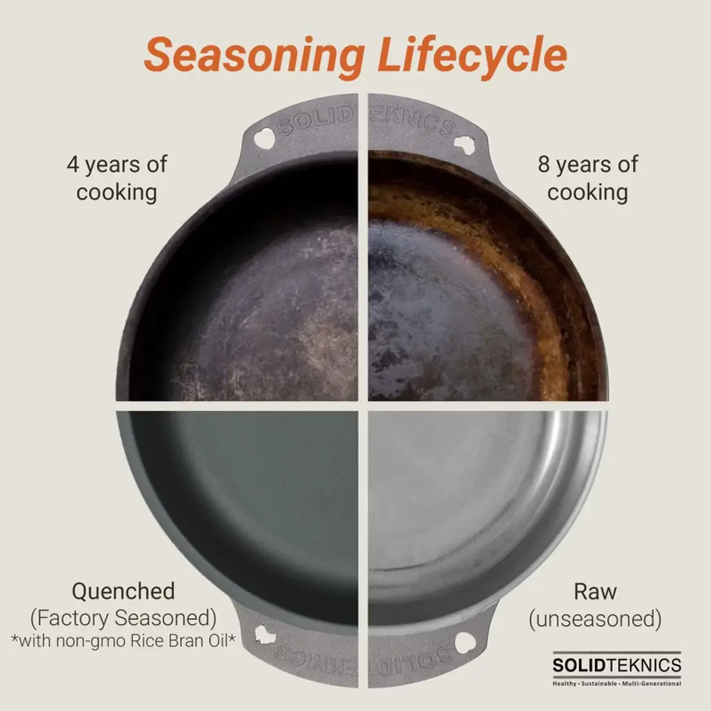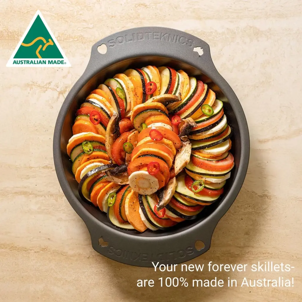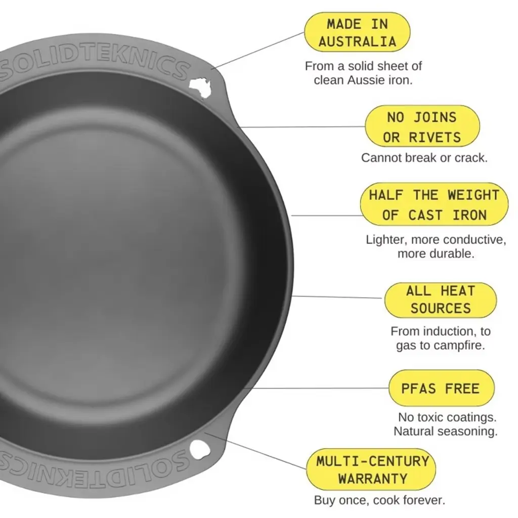 The Solidteknics AUS-ION Oven-to-Table Skillet is designed for cooks who value versatility, health, and sustainability in their kitchen. This skillet handles all your cooking needs, from frying eggs and meats to baking pies and pizzas. Its handle-free design ensures easy transitions from stovetop to oven to table, allowing you to cook and serve in the same dish. Solidteknics is committed to promoting healthy cooking with sustainable practices. This skillet is free from synthetic, toxic coatings, and is seasoned with natural, non-GMO rice bran oil. Ready to use straight out of the box, it’s compatible with all heat sources, including induction, BBQ, and campfires, making it ideal for both indoor and outdoor cooking. While lightweight, this skillet offers the benefits of cast iron cooking with half the weight, making it easy to handle without compromising on performance. Crafted from a single sheet of solid iron, this skillet is built to last through generations, backed by a multi-century warranty. The Solidteknics AUS-ION skillet is more than just cookware—it’s a kitchen essential destined to become a family heirloom, cherished for its durability and reliability. Choose Solidteknics for a healthier, more sustainable cooking experience with results that you can count on every time.