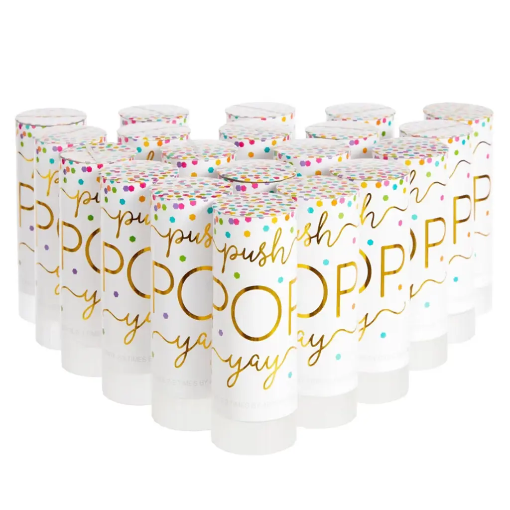 Welcome to the ultimate party starter! Let your guests ring in the new year with these mesmerizing rainbow foil confetti holders. The sound of the shakers and the sight of the multicolor confetti raining down on your loved ones will fill the room with joy and excitement, making memories that will last a lifetime. The shakers are packed with 1cm multicolored foil discs that shine and shimmer in the light, creating a truly magical atmosphere. And, with each order, you'll receive a pack of 20 shakers, ensuring that everyone can join in on the fun. The white tissue paper covering the shakers adds a touch of elegance to your party decor, while the gold "Push POP Yay" message on the side adds a playful and celebratory element to the festivities. Don't miss out on the opportunity to add a touch of enchantment to your celebration. Order these rainbow foil confetti party shakers today and get ready to create unforgettable memories that will bring a smile to your face for years to come. Let's welcome the new year with a burst of color and a whole lot of joy!