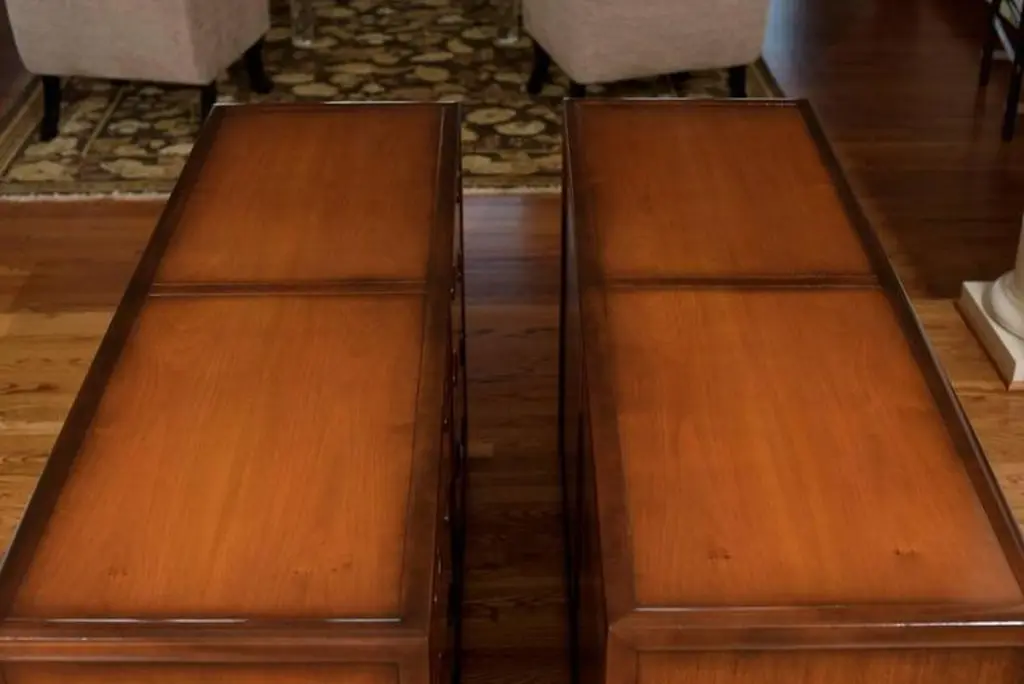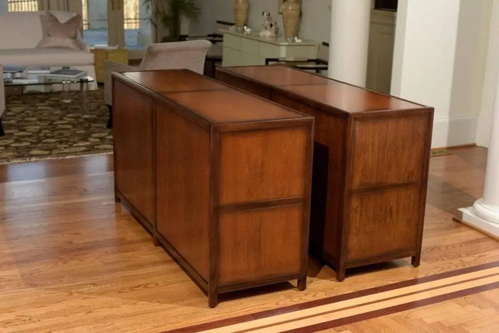 This magnificent chest is shipped as professionally photographed and described in the listing narrative: Meticulously professionally restored and completely installation ready. Match pair available.A fabulous commode by Baker Furniture, circa 1960. This difficult to find example is from the boutique "New World" collection designed by the esteemed Michael Taylor. Expertly crafted solid hardwood construction with handsome lines and detail. Exquisitely veneered in bookmatch cherry. Carved walnut pulls finished in chocolate lacquer. The backs are completely finished in bookmatch cherry. The wood displays exceptional color, grain and movement. The unmistakable look of old money. Excellent Restored Condition. The pieces have been professionally cleaned and re-lacquered. The finish demonstrates wonderful tone, depth and sheen. Retains the Maker mark. There are a match pair of these chests available. The price listed is for one chest.