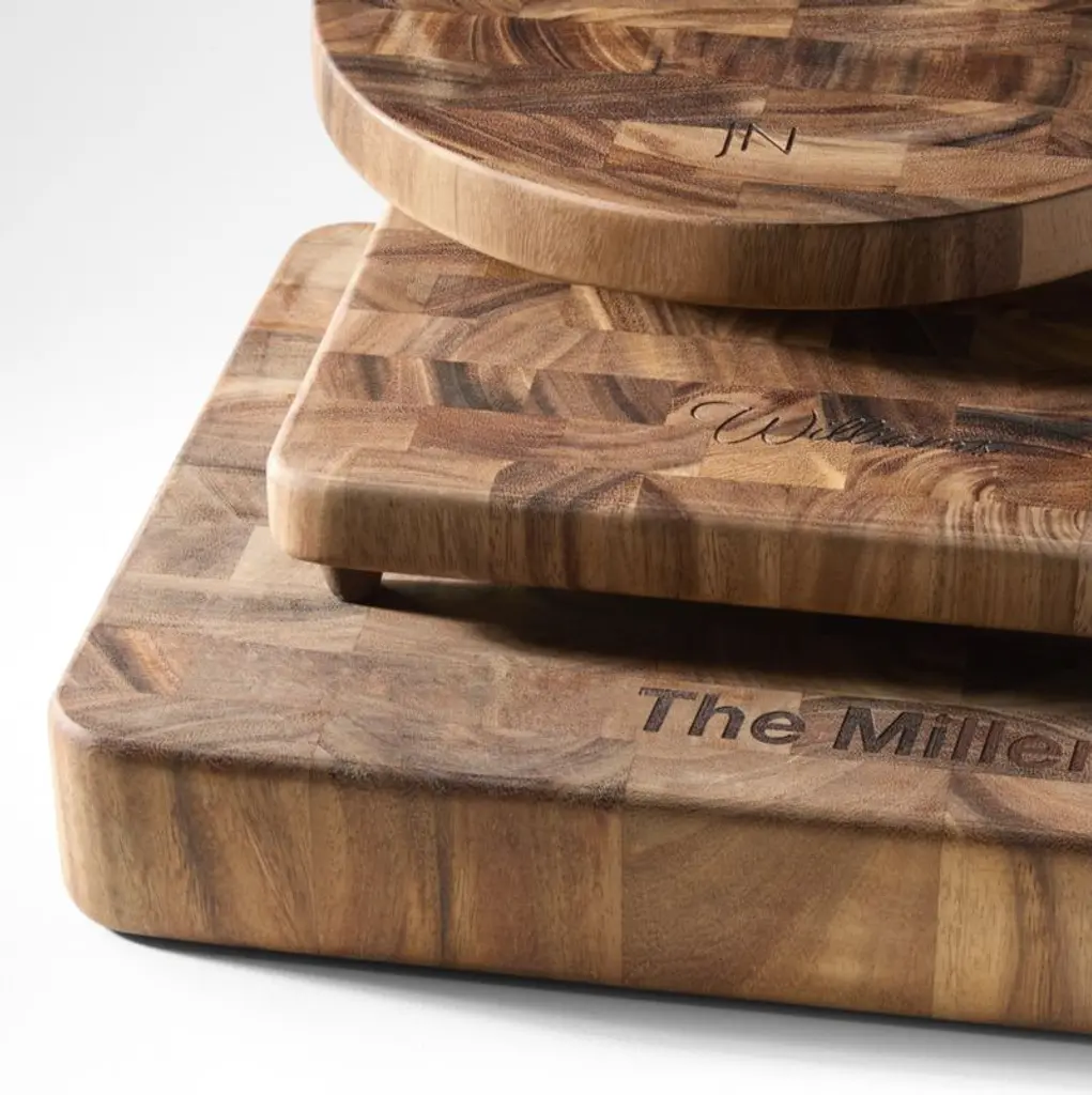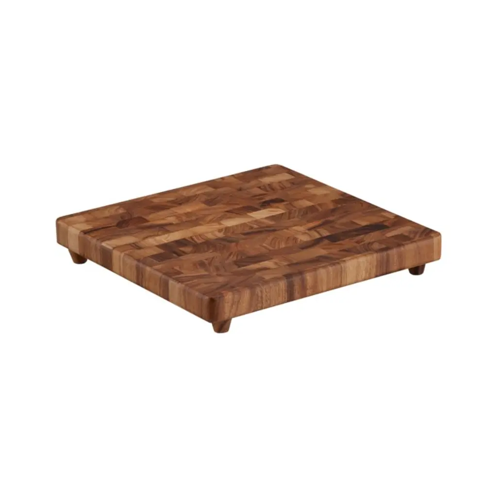 Butcher-block cutting board featuring extra-strength construction in beautiful end-grain acacia wood. Rich natural contrasts in tone render each thick, footed chopping board unique. The perfect work surface for chopping and slicing, it also makes a buffet statement serving up breads, cheeses or charcuterie..