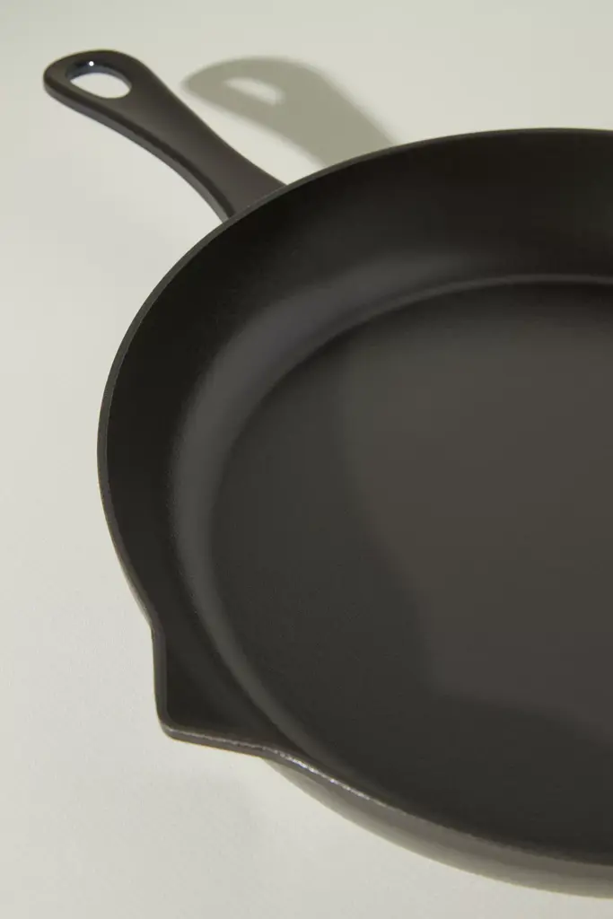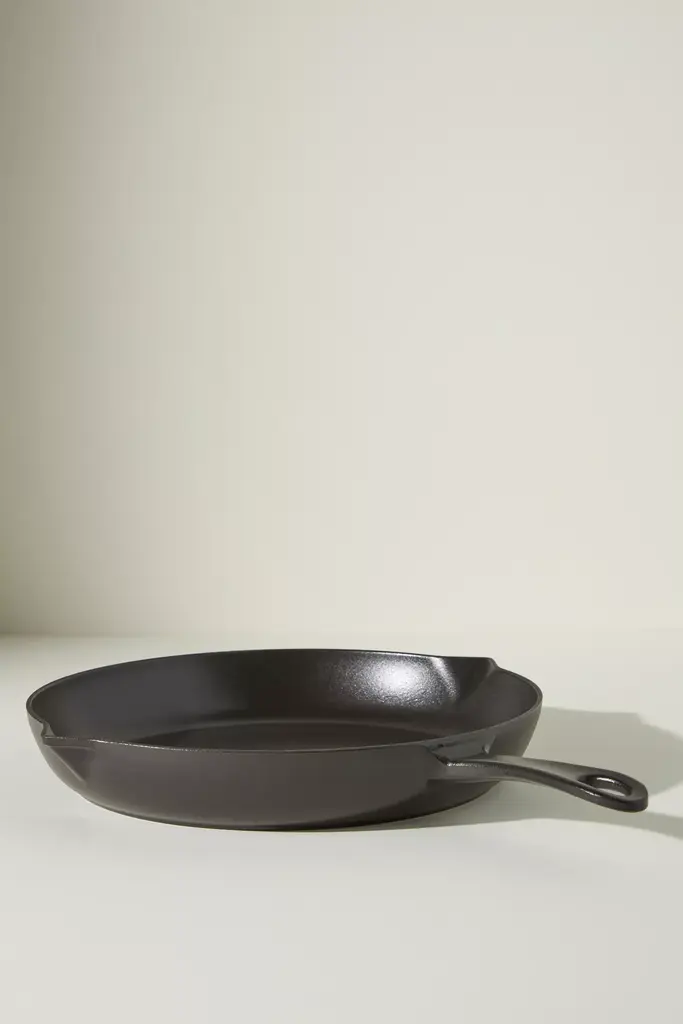 Perfect for everyday meal prep, Staub fry pans are optimized for high heat cooking. The enameled cast iron interior has exceptional heat-retention qualities and browning ability, and is ideal for searing meat, frying bacon, and browning chicken and potatoes. The pan heats evenly throughout, and the side pouring spouts offer easy grease removal. When its time to serve, you can bring the pan straight from the oven or stove to the table.