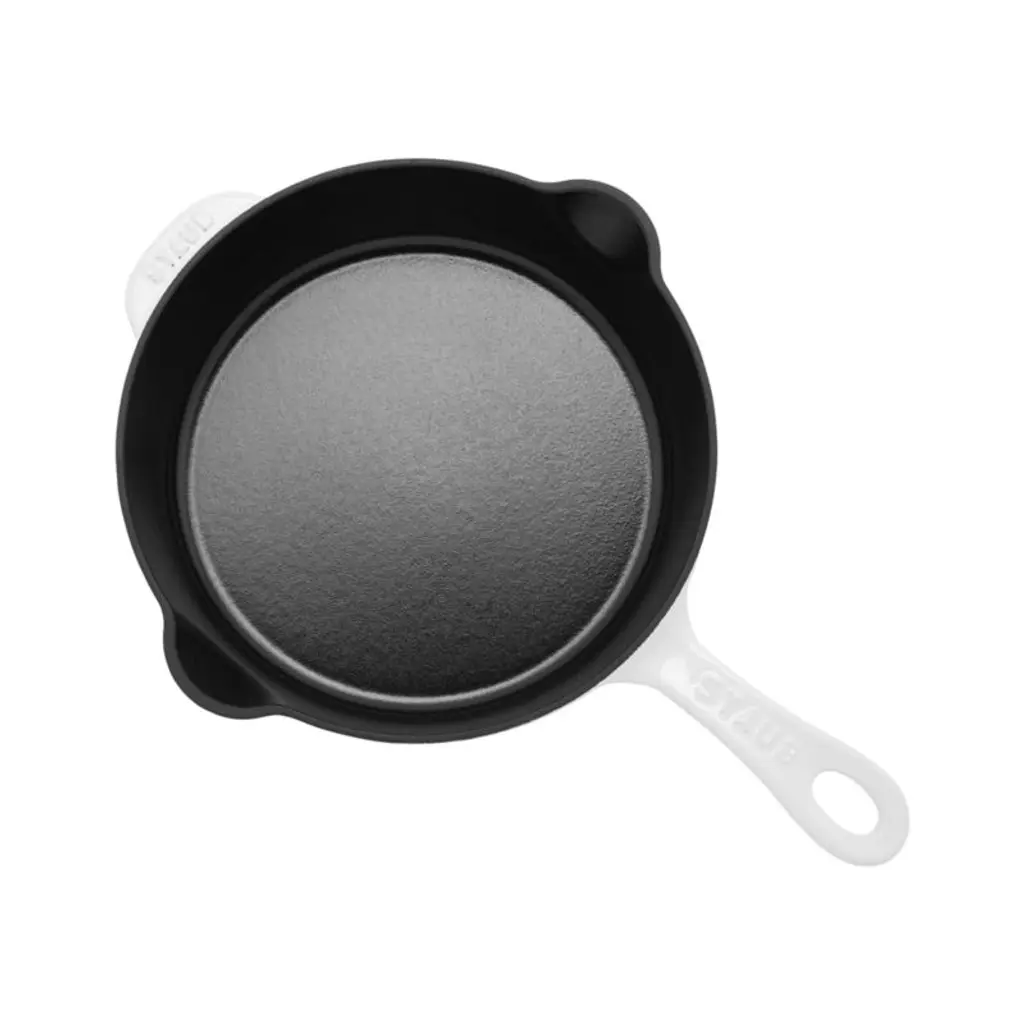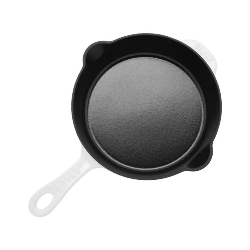 Enameled in fresh white, this display-worthy cast iron skillet goes from stovetop to oven to table. The deep skillet combines the best of a frying pan and a saute pan, with even heat distribution over the entire base of the pan plus high sides that accommodate stirring and prevent spills. Spouts make it easy to pour sauces and gravies or remove fat. Staub's signature textured matte black enamel interior browns and caramelizes foods beautifullyplus it's scratch resistant, easy to clean and requires no seasoning. A beautiful addition to any table, the skillet particularly pops among black dinnerware and table linens.Preferred by some of the world's greatest chefs, Staub's signature cast iron cookware has been crafted in France for over 40 years.