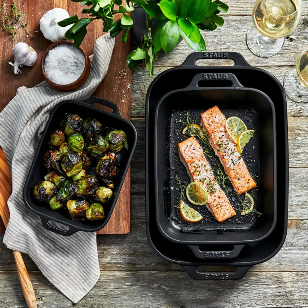 Staub bakes breakfast, dinner and dessert with a trio of stoneware baking dishes with a glass-porcelain enamel finish that prevents absorption of moisture. Enjoy warmly spiced apple crumble, cheesy lasagna and decadent peppermint brownies baked in the matte black ceramic bakers. Extremely resistant to impact and thermal shock, the dishes go straight from freezer to oven to table for a classic presentation, with loop handles providing a sturdy grip.Rooted in French culinary heritage, Staub cookware is beloved by professional and home chefs for its exquisite craftsmanship, exceptional performance and timeless beauty.