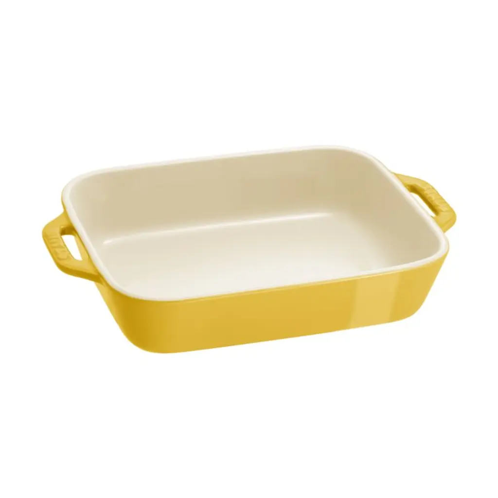 The three baking dishes in this set sport lemony yellow exteriors to brighten up everyday baking and tableside serving. Glazed with porcelain enamel, the stoneware baking dishes prevent moisture absorption for superior results and can be used in the microwave, oven and broiler. Resistant to scratching and equipped with loop handles, the citron yellow ceramic bakers in the three-piece set nest for easy storage.Rooted in French culinary heritage, Staub cookware is beloved by professional and home chefs for its exquisite craftsmanship, exceptional performance and timeless beauty.