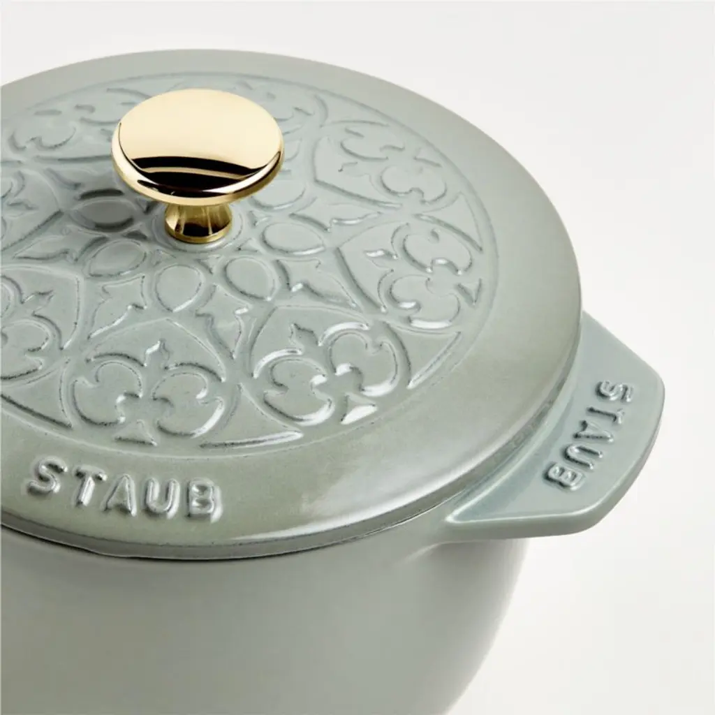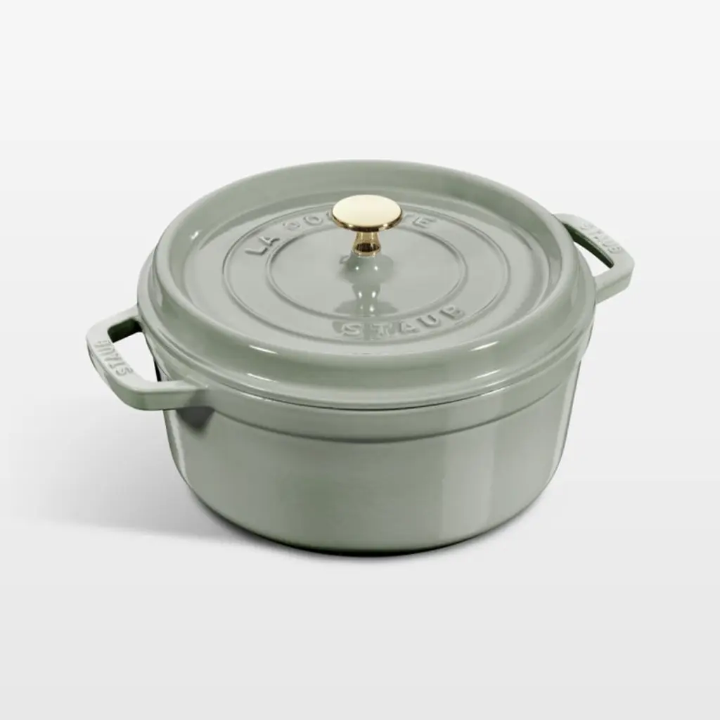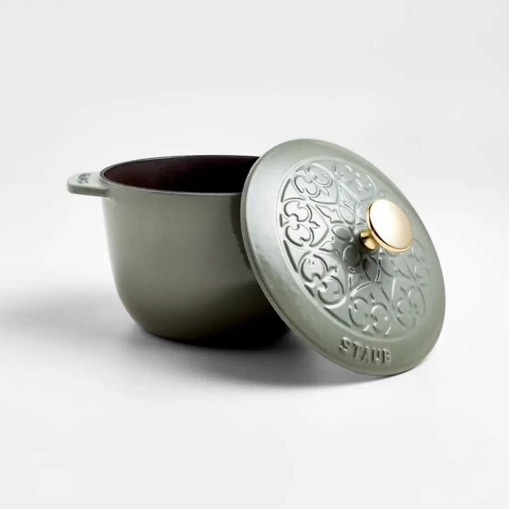 Enameled in a eucalyptus-inspired hue made just for Crate & Barrel, this petite grey-green French oven cooks evenly and efficiently and resists chipping. Its signature matte-black enamel interior excels at braising, roasting and caramelizing, and is scratch resistant and easy to clean. The cast iron pot is a timeless standby, perfectly proportioned for cooking eggs, rice, jam and sauces. To ensure moist and flavorful results, the spiked lid topped with a brass knob is designed to create a rain-forest effect that returns juices back on the food for continuous, natural basting. Our exclusive French oven goes from stove to oven to table for a gorgeous presentation.Staub's signature cast iron cookware has been crafted in France for over 40 years.