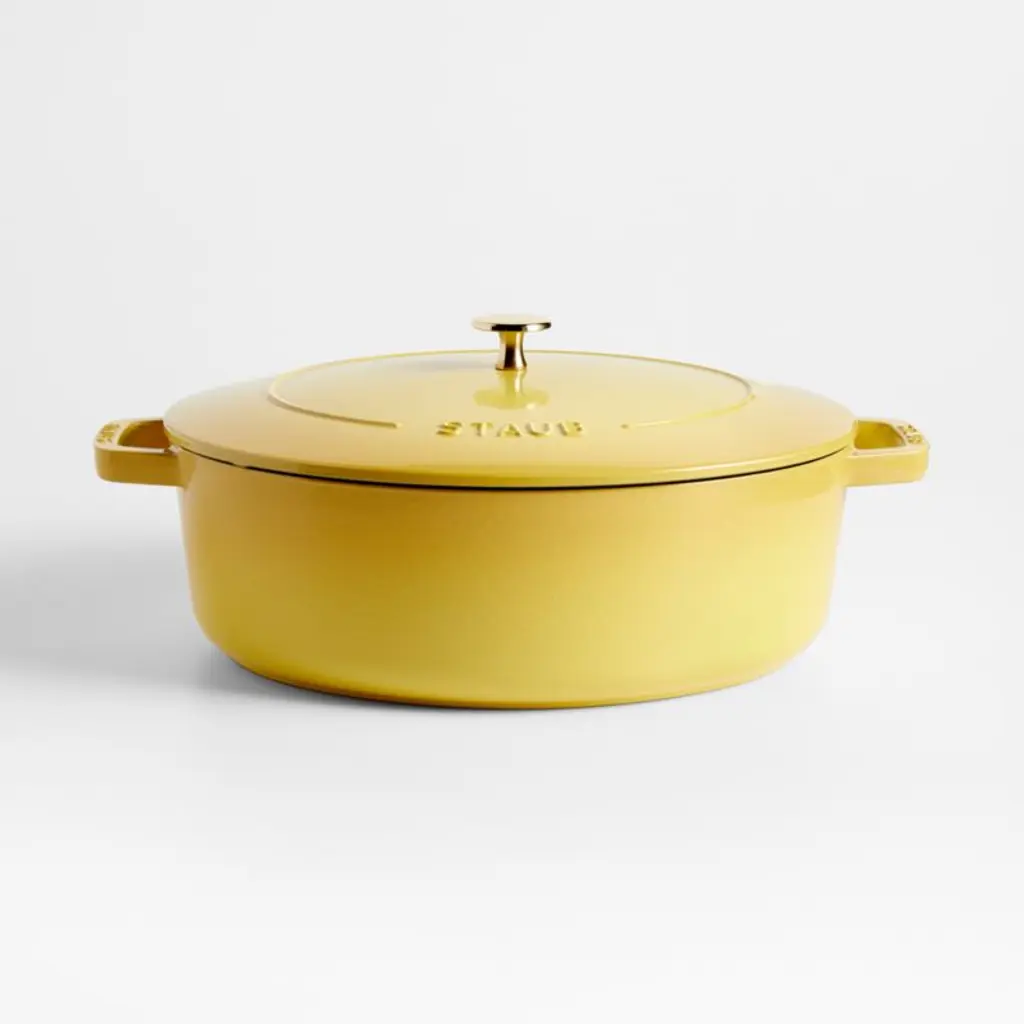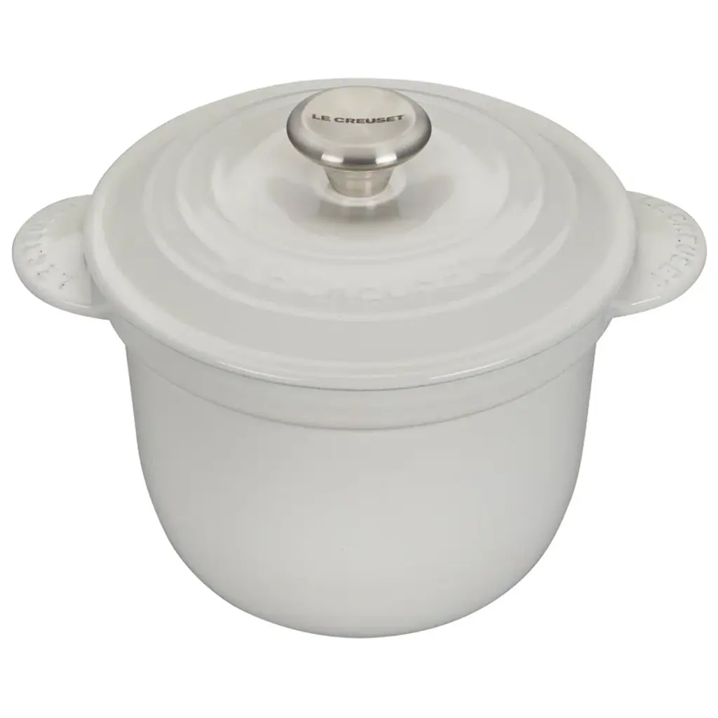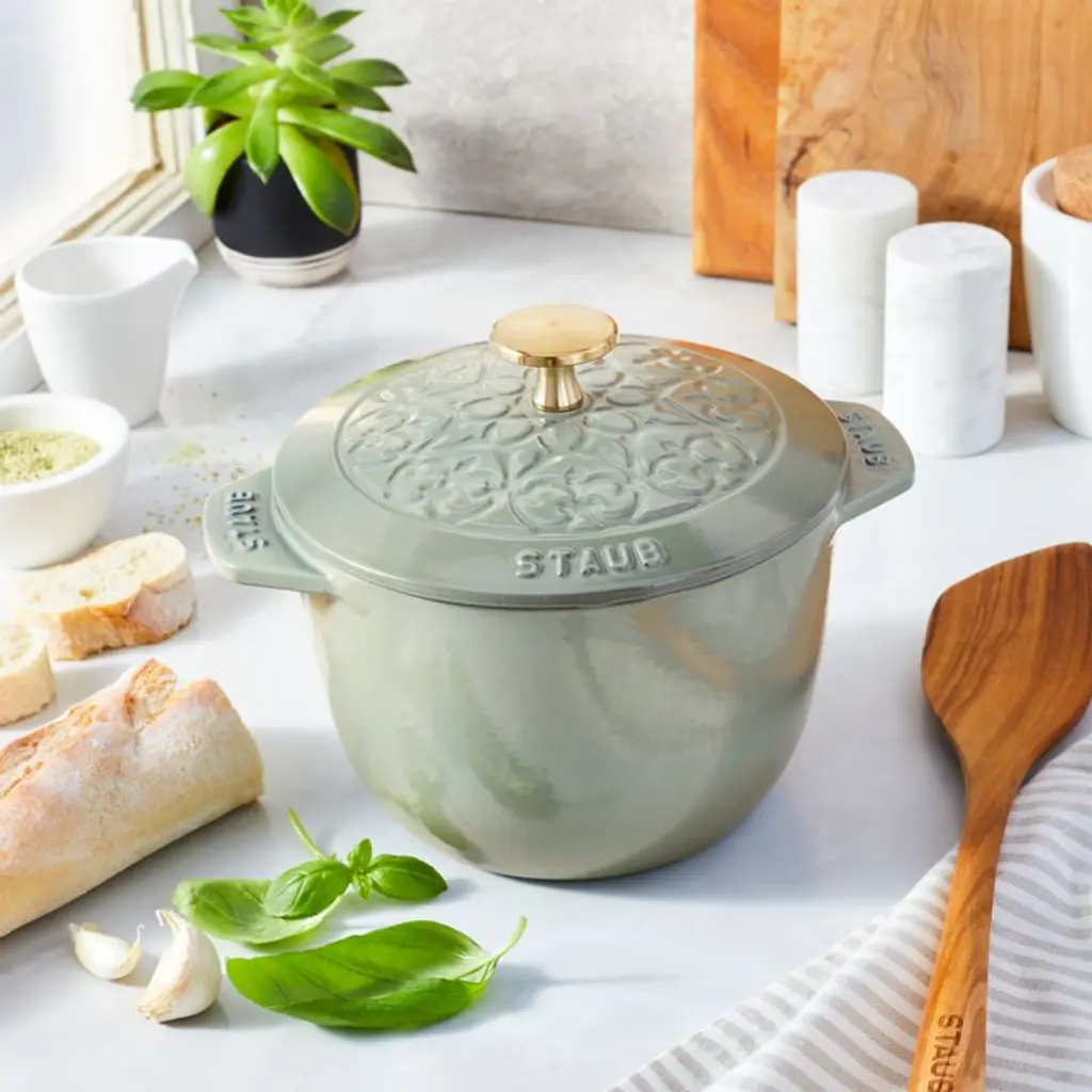 Enameled in a eucalyptus-inspired hue made just for Crate & Barrel, this petite grey-green French oven cooks evenly and efficiently and resists chipping. Its signature matte-black enamel interior excels at braising, roasting and caramelizing, and is scratch resistant and easy to clean. The cast iron pot is a timeless standby, perfectly proportioned for cooking eggs, rice, jam and sauces. To ensure moist and flavorful results, the spiked lid topped with a brass knob is designed to create a rain-forest effect that returns juices back on the food for continuous, natural basting. Our exclusive French oven goes from stove to oven to table for a gorgeous presentation.Staub's signature cast iron cookware has been crafted in France for over 40 years.