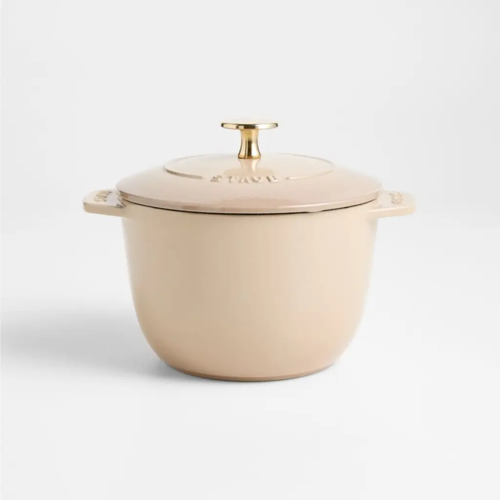 Enameled in a toasty, creamy sesame-inspired hue, this petite French oven cooks evenly and efficiently and resists chipping. Its signature matte-black enamel interior excels at braising, roasting and caramelizing, and is scratch resistant and easy to clean. The cast iron pot is a timeless standby, perfectly proportioned for cooking eggs, rice, jam and sauces. To ensure moist and flavorful results, the spiked lid topped with a brass knob is designed to create a rain-forest effect that returns juices back on the food for continuous, natural basting. The French oven goes from stove to oven to table for a delightful presentation.Preferred by some of the world's greatest chefs, cookware from Staub of France is renowned for its superior heat retention and oven-to-table good looks.