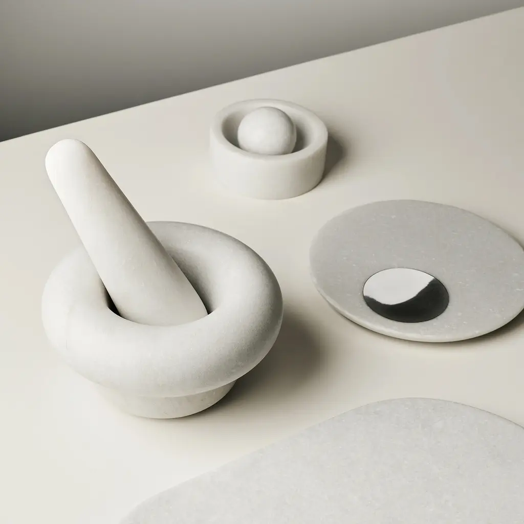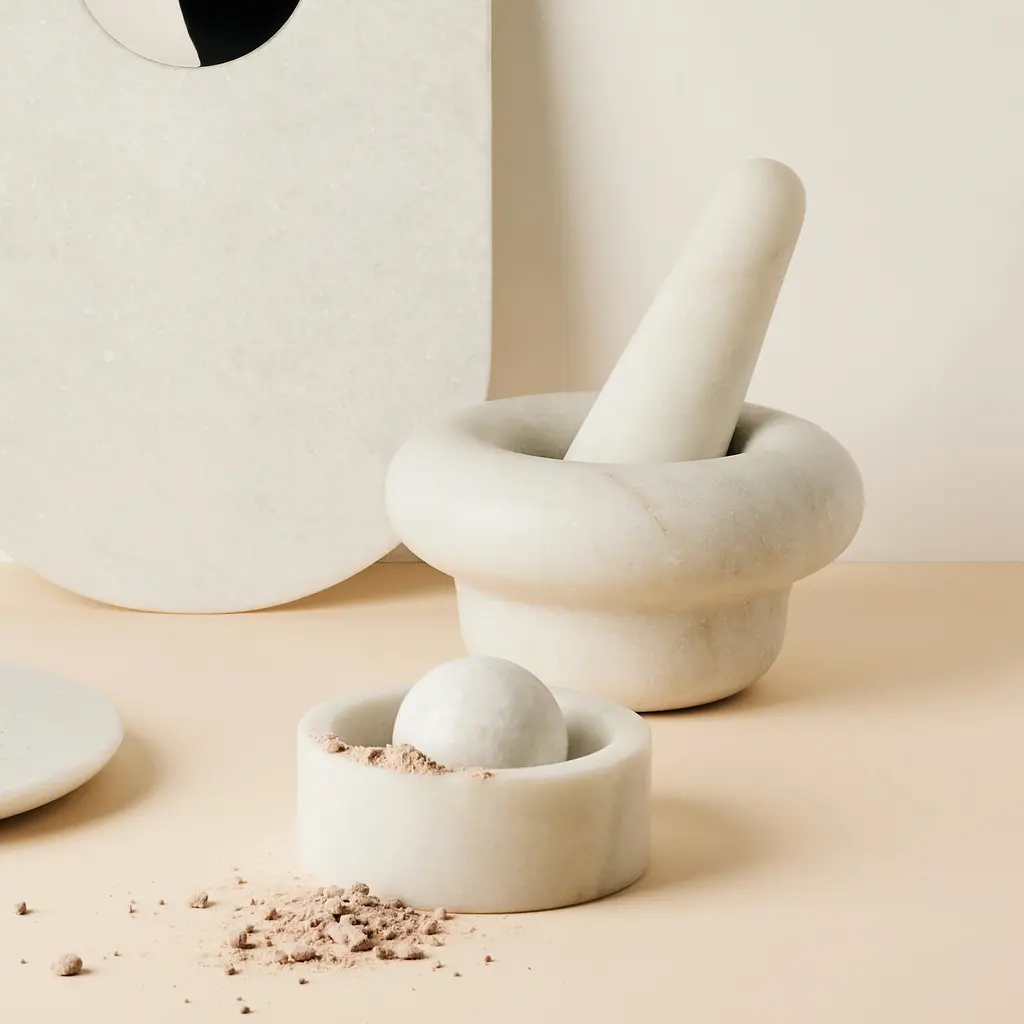 Behold the most stylish way to grind spices and herbs. Part of the Stone collection from Tom Dixon, the Stone Pestle and Mortar celebrates the beauty of marble. The mortar is crafted from white Morwad marble, while the brass pestle features a warm gold wash finish. Designed with an exaggerated rounded lip, the mortar provides the user a perfect grip when crushing and grinding spices. Beautiful on its own, the Stone Pestle and Mortar is an ideal accompaniment to the spice grinder and the chopping board from the same collection. This product comes in an elegant mango wood box, which makes it a great choice as a gift.