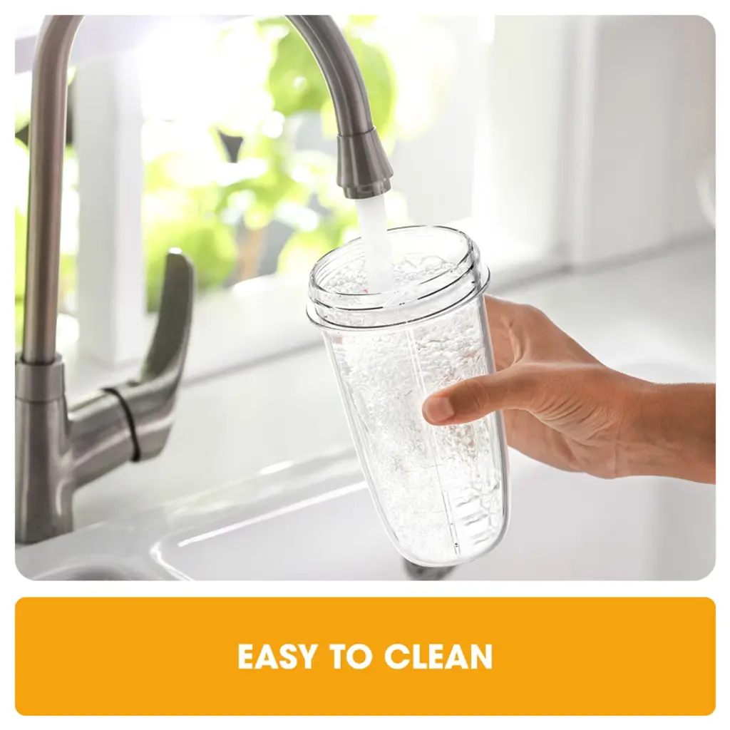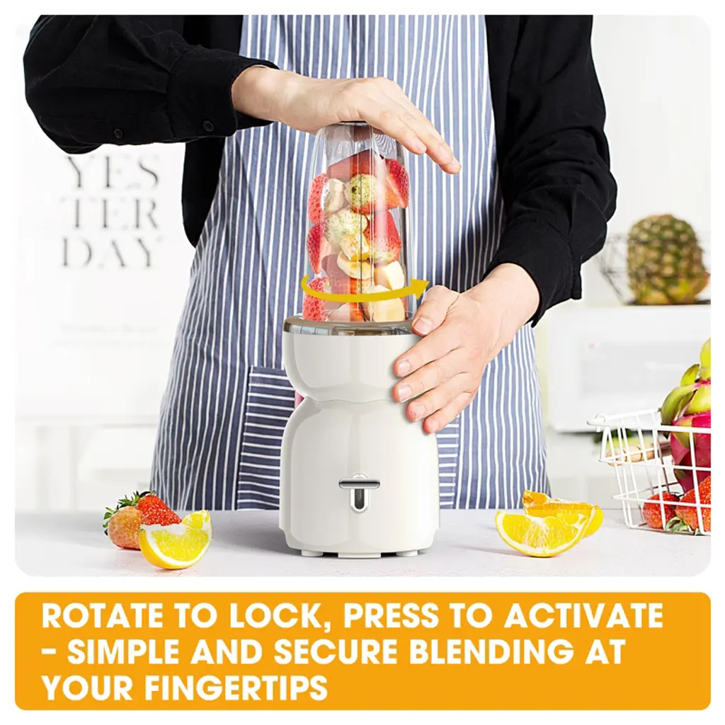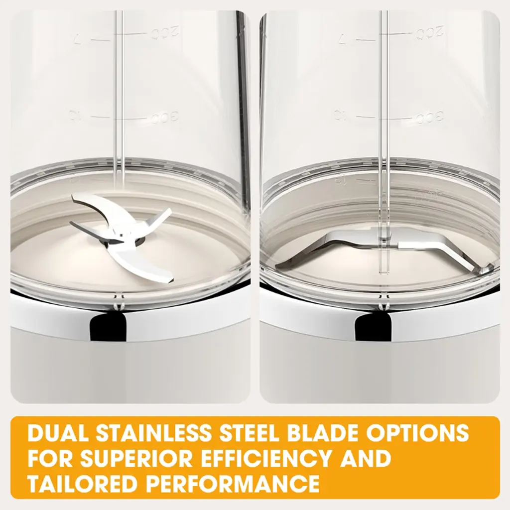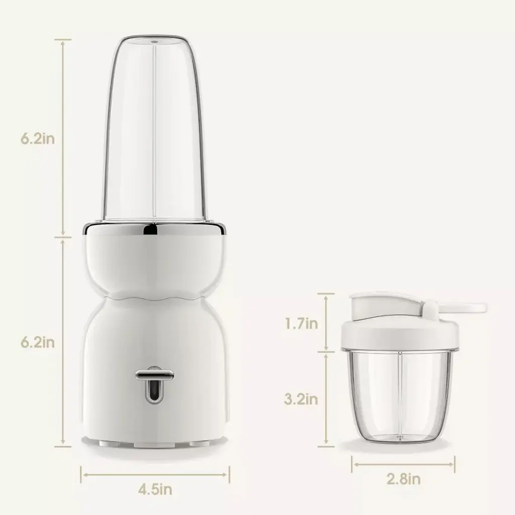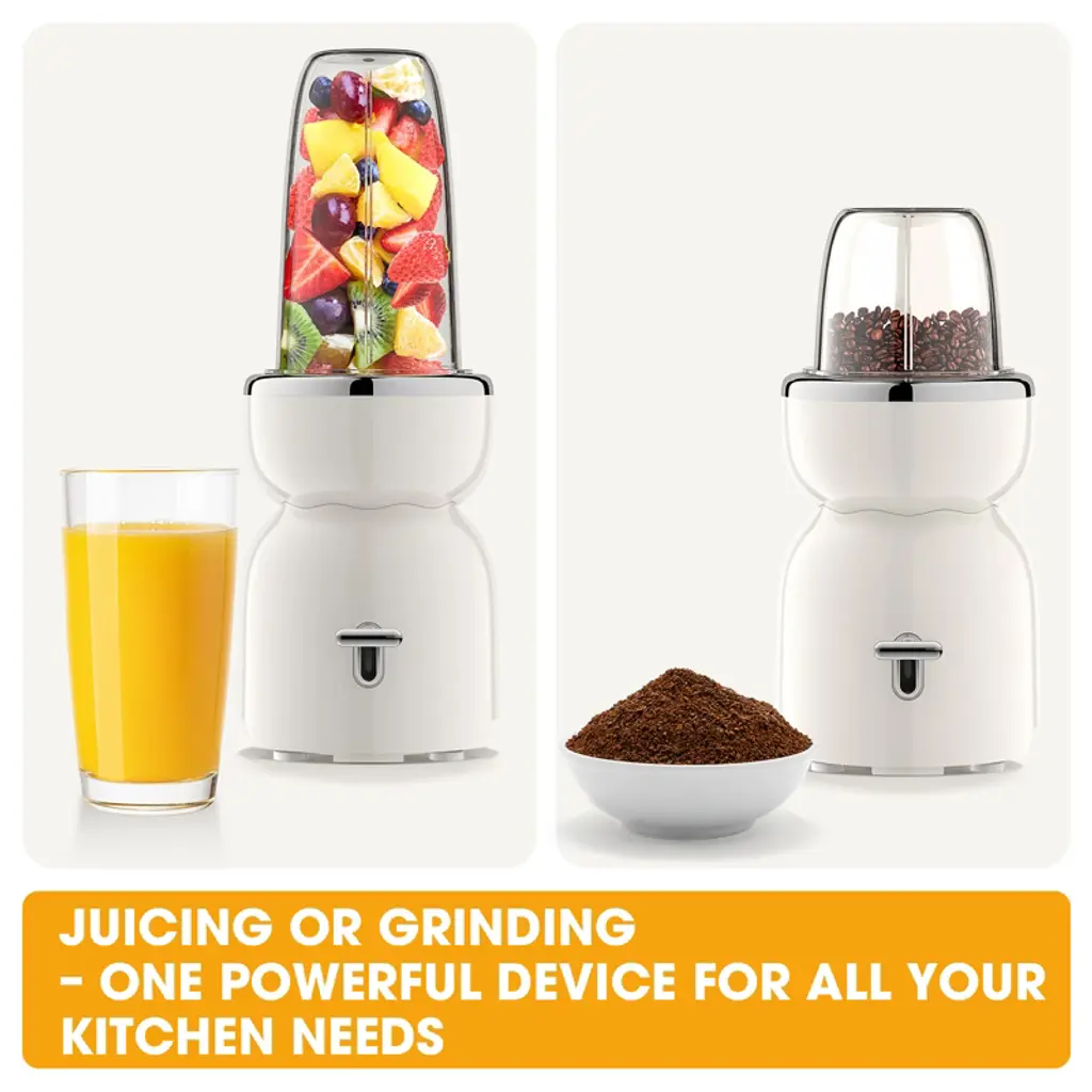Simplify your kitchen routine with this compact 2-in-1 personal blender and grinder. Whether you're blending a fresh smoothie or grinding coffee beans and spices, this multi-functional appliance handles it all. Featuring a powerful 250W high-speed motor and dual stainless steel blade sets, it delivers consistent, smooth results with every use. The set includes a 14 oz blending cup and a 7 oz grinding cup—both made from durable, BPA-free plastic—and secure lids for mess-free operation. With its easy twist-to-lock and press-to-blend function, it’s perfect for quick mornings, small kitchens, dorms, or travel. Cleanup is just as easy with detachable cups and rinse-clean blades. Features 2-in-1 Blender & Grinder: Blend smoothies or grind coffee and spices—one compact unit does it all. Dual Stainless Steel Blade System: Includes two blade assemblies tailored for smooth blending and precise grinding. BPA-Free Cups in Two Sizes: Comes with a 14 oz smoothie cup and a 7 oz grinder cup, both with secure lids. Safe & Simple Operation: Just twist to lock and press to blend—intuitive and secure use every time. Quick & Easy Cleaning: Detachable parts rinse clean under water; sleek body wipes down in seconds. Specification Power: 250 Watts Motor Type: High-speed motor Blade Material: Stainless Steel (2 sets included) Cup Sizes: 14 oz (blending), 7 oz (grinding) Cup Material: BPA-free plastic Product Dimensions Base: 6.2" H x 4.5" W Cup Heights Blender Cup: 6.2", Grinder Cup: 3.2" Grinder Lid Height: 1.7" Grinder Diameter: 2.8" Color: White with chrome accents Operation Twist to lock, press to blend Cleaning: Hand wash recommended; rinse & wipe design Functions: Juicer, smoothie blender, spice/coffee grinder