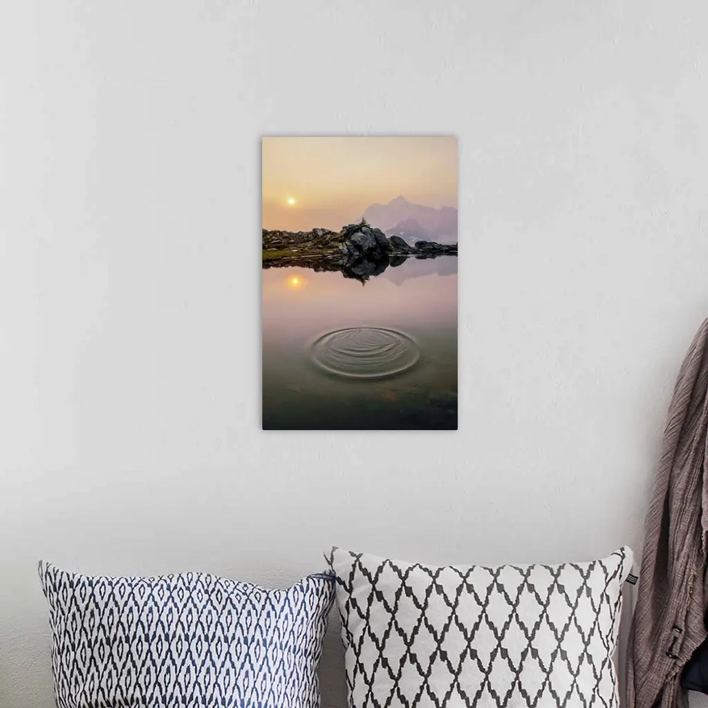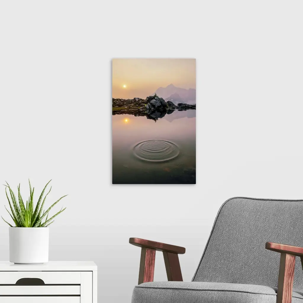 A ripple on a pond near Artist Point Trail with the sun rising over Mount Shuksan in the background, Washington.
