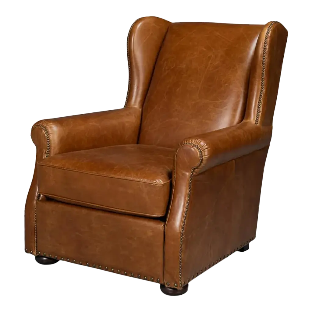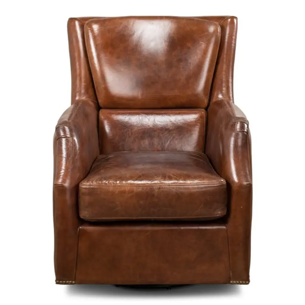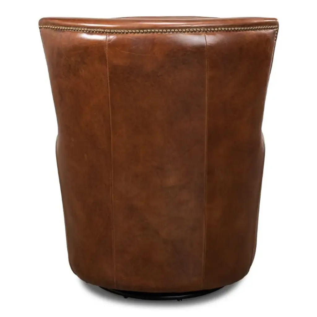 Lending welcoming warmth and serious comfort, this handsome brown leather swivel wing chair, is always in style. Detailed stitching and antiqued brass nail tacks elevate this iconic design. Try this in multiples for a cozy conversation pit. Due to the organic nature of leather and hides there may be slight variances in color and pattern as well as scarring which is considered a unique attribute of the material and not a defect.