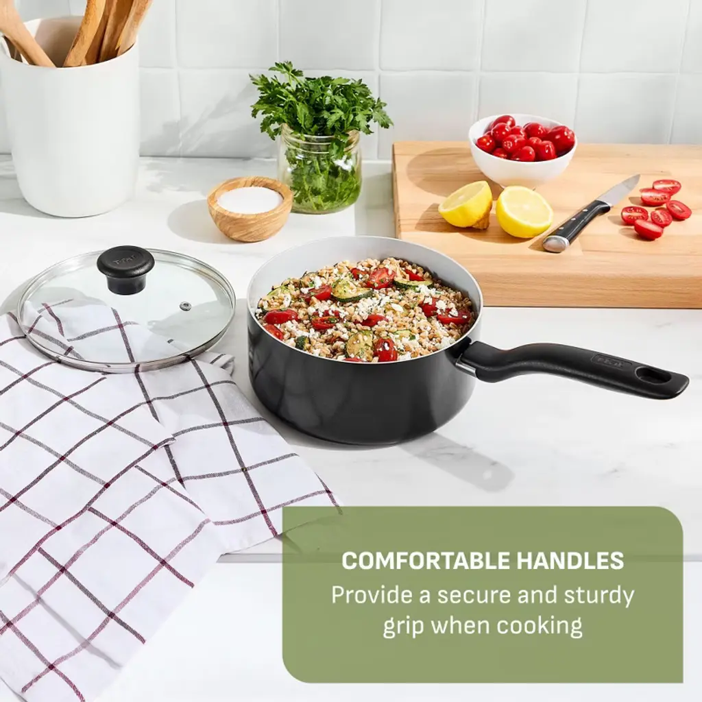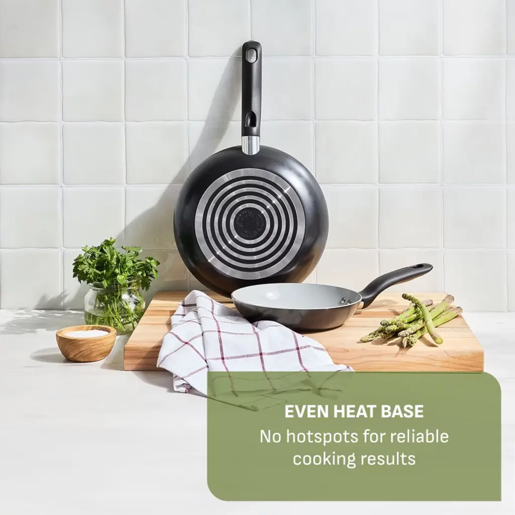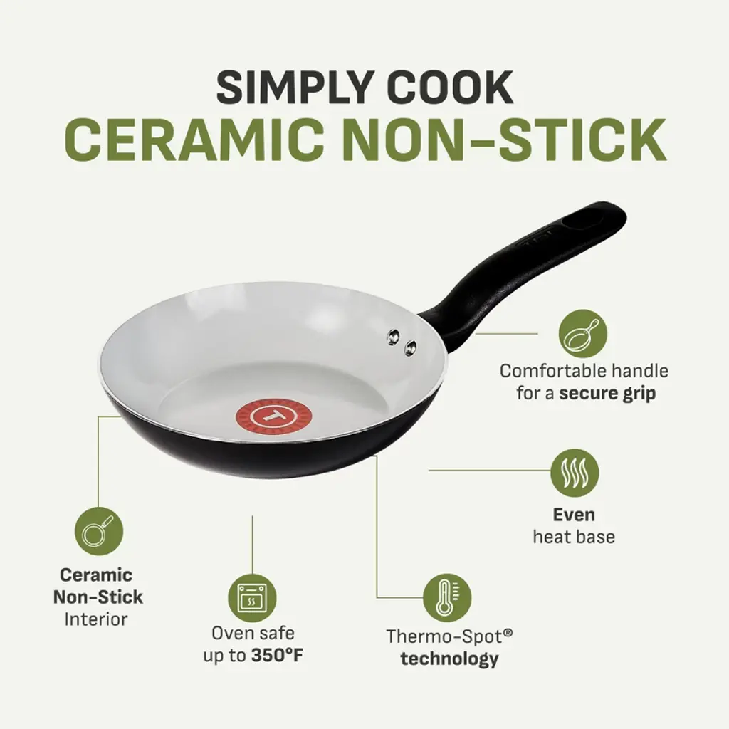 Bring convenience and reliable performance to your kitchen with the Simply Cook Ceramic 8 inch and 10.5 inch frypan set. Made with a 100% recycled aluminum body and a durable ceramic non-stick interior that needs little to no oil for healthier cooking, it reduces your eco-impact while allowing you to prepare delicious meals. Thermo-Spot® Technology signals when the pan is perfectly preheated, so you can start every recipe with confidence. The even heat base heats quickly and helps prevent hot spots, while the sturdy, comfortable handles make cooking and serving easier. Oven safe up to 350°F and dishwasher safe — make cooking simpler every time with T-fal Simply Cook ceramic collection.About Us: For over 60 years, T-fal has been at the forefront of kitchen innovation, starting with the world’s first non-stick cookware. Our brand was built on the idea of making every day cooking easier, faster, and more enjoyable. From intuitive design to time-saving features, T-fal delivers reliable performance for home cooks who want great results without the hassle. Designed for those who value simplicity and innovation, T-fal helps you cook with ease and confidence, every day.