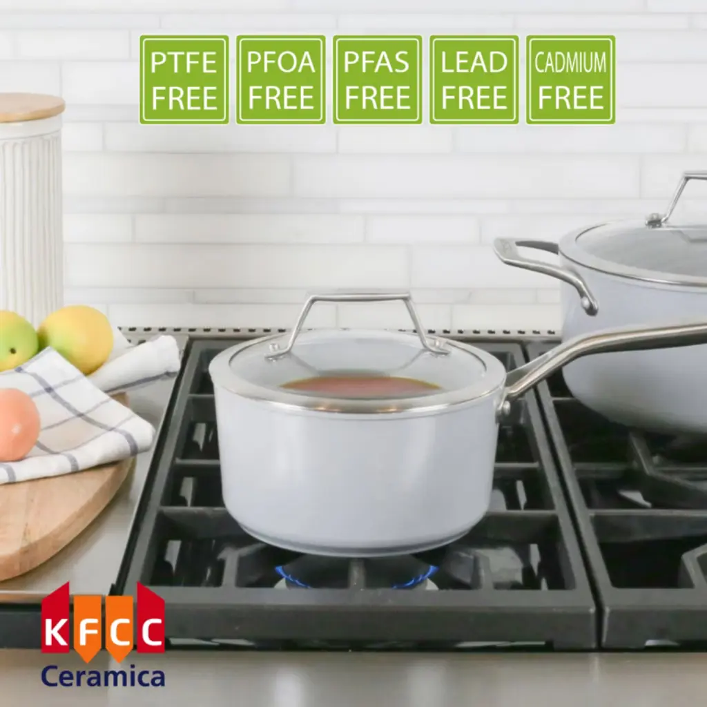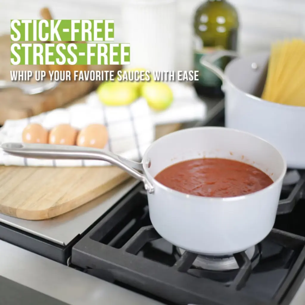 The CeraTerra 2-quart Ceramic Nonstick Saucepan offers superior cooking performance and versatility. Made from forged heavy-gauge aluminum, it ensures even heat distribution and prevents hot spots, providing consistent results every time. Its toxin-free "CERAMICA" coating, free of PFOA, PTFE, PFAS, Cadmium, and Lead, ensures a healthier, nonstick cooking experience with easy cleanup. Designed with an elegant forged rim for smooth pouring, this saucepan also features an induction-ready base that works on all stovetops and prevents warping. The double-riveted stainless steel handle stays cool during cooking for added comfort and strength. Oven-safe up to 450°F and dishwasher safe, the TECHEF CeraTerra saucepan is ideal for a variety of tasks, from simmering sauces to boiling and reheating, making it a valuable addition to any kitchen.