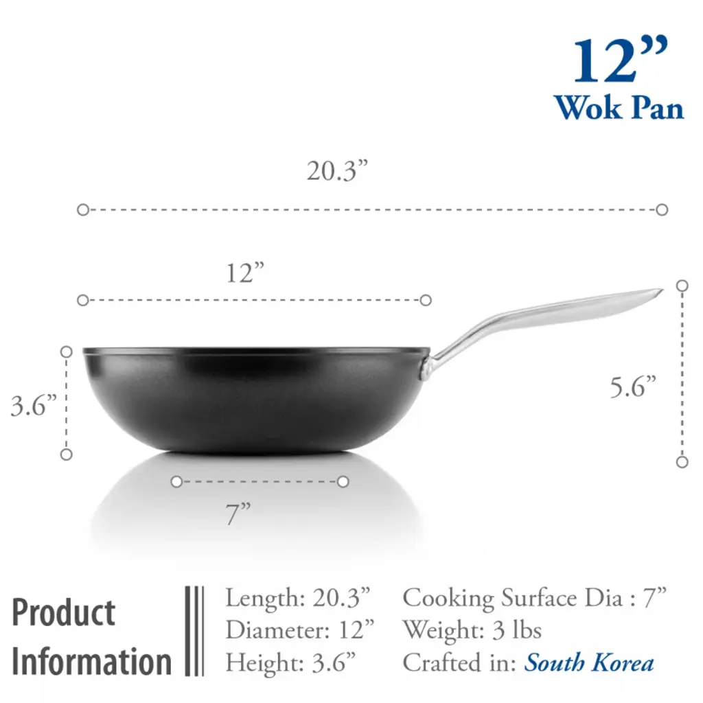 The Onyx 12" Nonstick Wok/Stir-Fry Pan is built for superior performance and versatility. Crafted from extra-heavy gauge forged aluminum, it ensures even heat distribution and prevents hot spots, making it ideal for stir-frying, deep-frying, steaming, roasting, and more. The highly durable, PFOA-free 3-layer nonstick coating is metal utensil safe, ensuring effortless food release and easy cleanup. Its double-riveted stainless steel handle stays cool on the stovetop for safe handling, while the thick flat bottom heats evenly and sits securely on all stovetops, including induction. Oven-safe up to 450°F and dishwasher safe for easy cleaning, this wok is a true multipurpose kitchen tool.