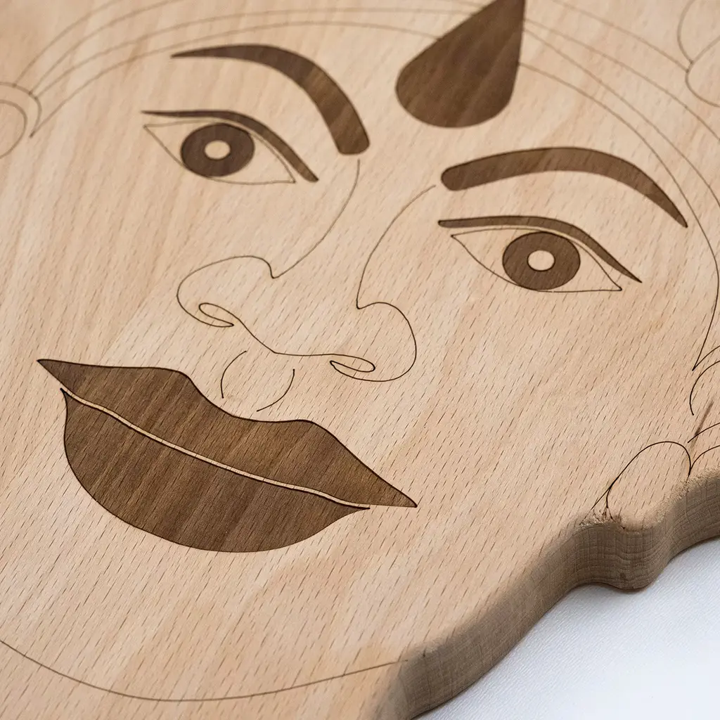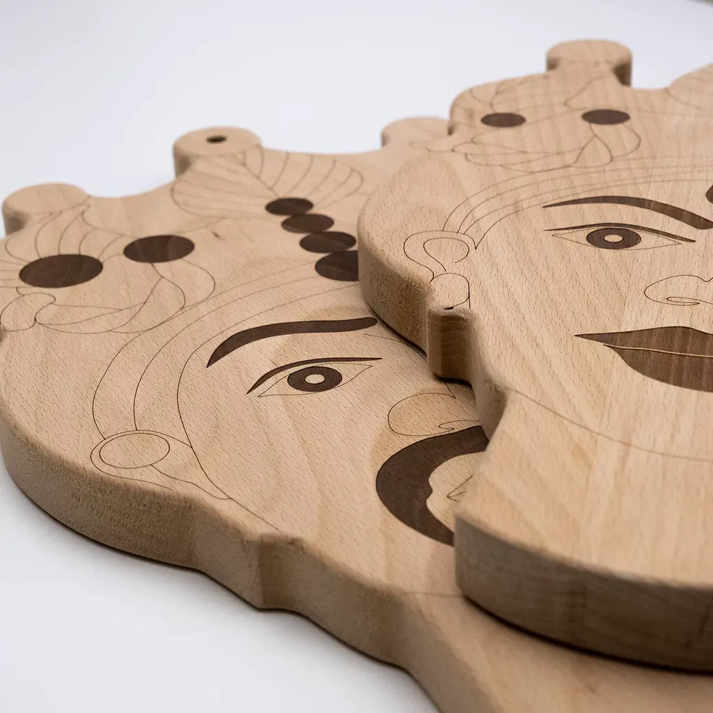Inspired by Sicilian traditional Moor's heads, this set of two cutting board designed by Gabriele E.M. D'Angelo. A classic decoration for vases, the man and woman's heads here decorate each a board, crafted of solid beechwood, cut with a laser and entirely finished by hand. The measurements are: for the man 24 x 1.8 x H40 cm, for the woman 22.5 x 1.8 x H38 cm.