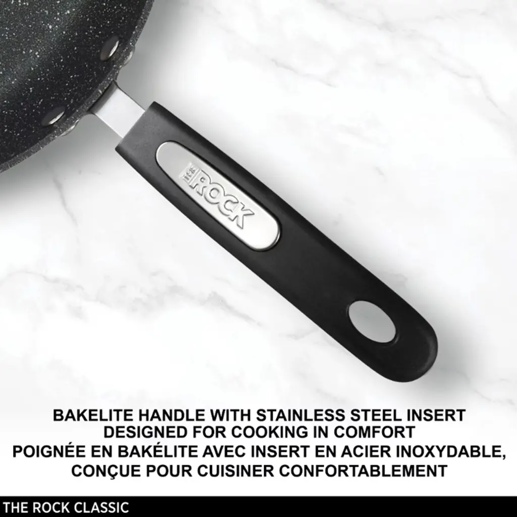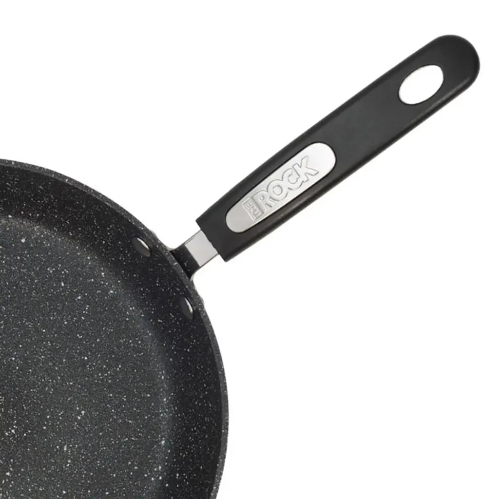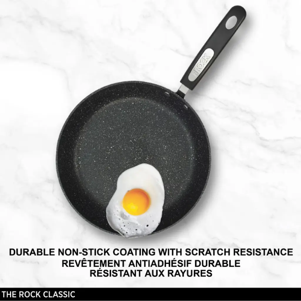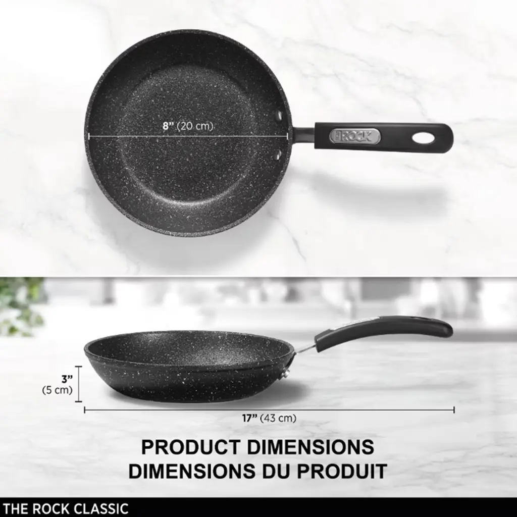 The ideal addition to your kitchen’s cookware, THE ROCK by Starfrit 8 in. Fry Pan with Bakelite Handle has a rocklike finish that makes it extremely durable. A thick, forged aluminum base makes this pan hardy, and spreads heat evenly for precise and thorough cooking. The patented Rock.Tec manufacturing process ensures superior nonsticking capability. The pan is also ovenproof, even under the broiler, up to 350°F. This handy, long-lasting pan will quickly become a staple in any cooking endeavor.