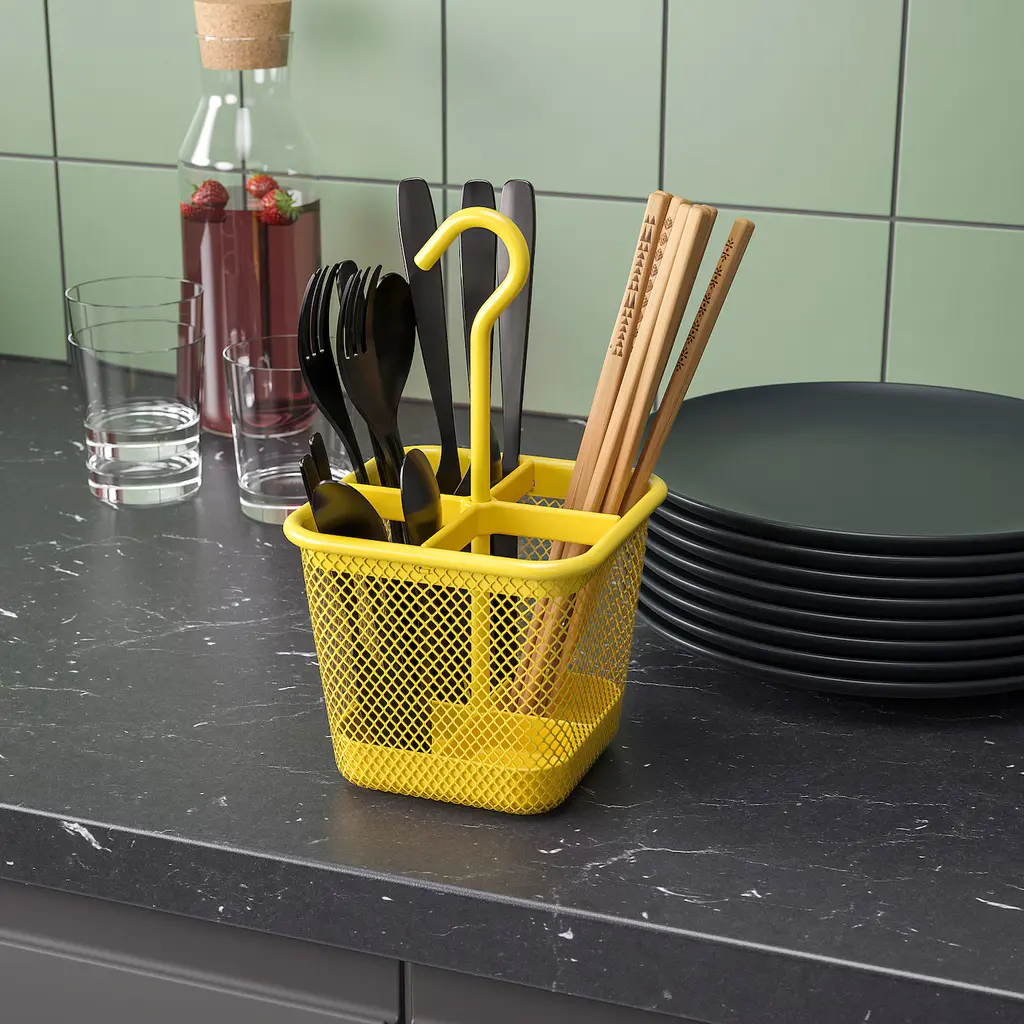 UPPDATERA Flatware caddy - yellow 4 ¾x4 ¾ ". Four compartments make it easy to keep cutlery organized. Place the cutlery caddy inside a drawer or keep it close at hand on the countertop. The handle makes it easy to move around, for instance when setting the table.