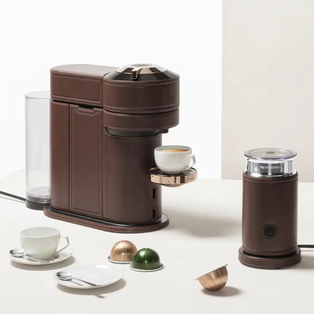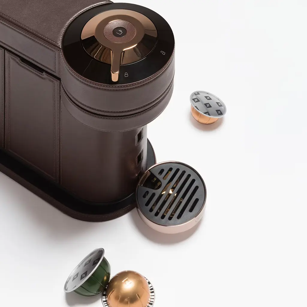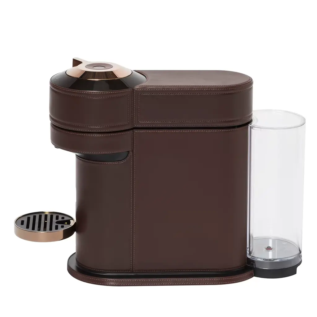Simplified version for hospitality. Leather-bound Nespresso machine. It uses vertuoline Nespresso capsules for Centrifusion technology which allows having a personalized coffee experience with a single button, covering a whole range of styles and five cup lengths. Voltage available: 110V (price available on request) or 220V.