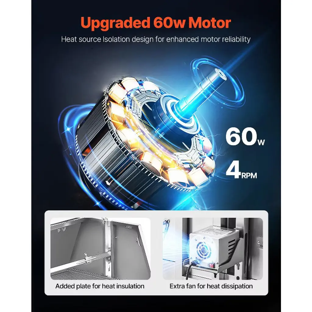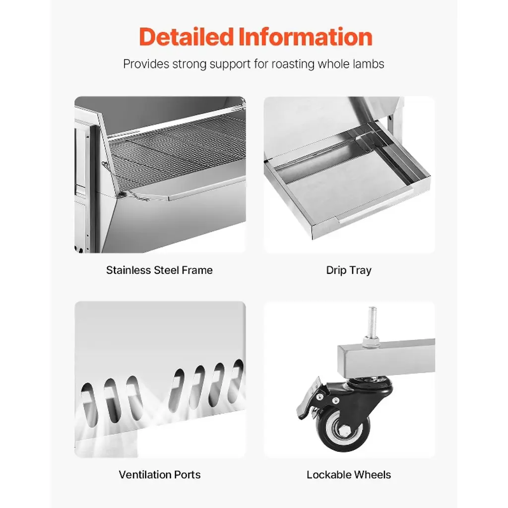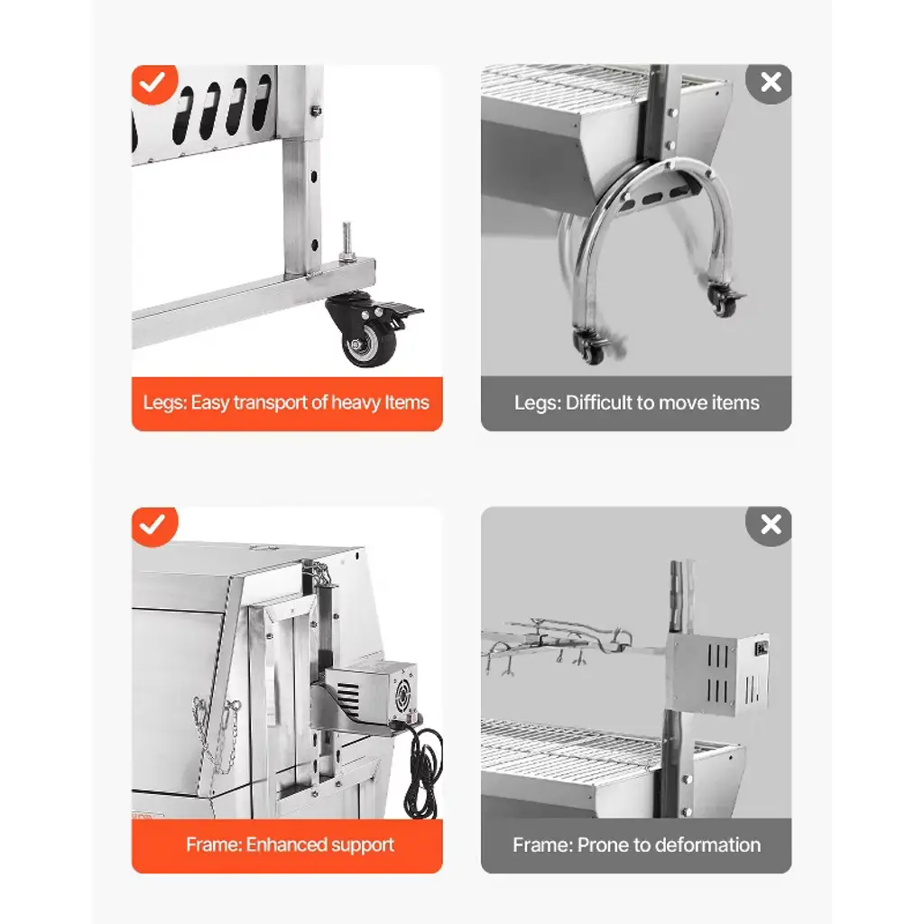 Feature: Enhanced Heat Shield: The grill rotisserie kit features a newly upgraded motor, making grilling easier! It includes a powerful 60W motor that can effortlessly rotate the spit rod at 4 RPM. The enlarged heat plate and increased motor fan power effectively block heat sources from impacting the motor, reducing motor malfunctions. Large Load Capacity: This bbq pig rotisserie kit has a total weight capacity of 286 lbs, with a grill net capable of carrying 198 lbs, and comes with an automatic barbecue fork. The barbecue baking tray provides a maximum width of 43cm, accommodating various meats simultaneously, allowing you and your family to enjoy an unparalleled smoky flavor. Note that the actual maximum load-bearing capacity is 88 lbs net weight after food processing. Durable and Easy to Clean: Made from sturdy stainless steel, the lamb grill roaster is designed to withstand various foods. It prevents wear, corrosion, and dust, ensuring long-term use. Easy to clean, simply wipe with a soft sponge. 56-Inch Spliced Spit Rod: This rod can hold larger-sized ingredients, making operation convenient. The lid design saves more space and is easier to store. User-Friendly Design: The stainless steel rotisserie roaster comes with 4 detachable and lockable wheels, making it easier to move and providing more stability while cooking. It includes a 56x13-inch large oil drip tray to prevent food grease from causing uncontrolled internal temperatures, maintaining the flavor of the roast. Package Content 1 x Rotisserie Grill 1 x Set of Accessories