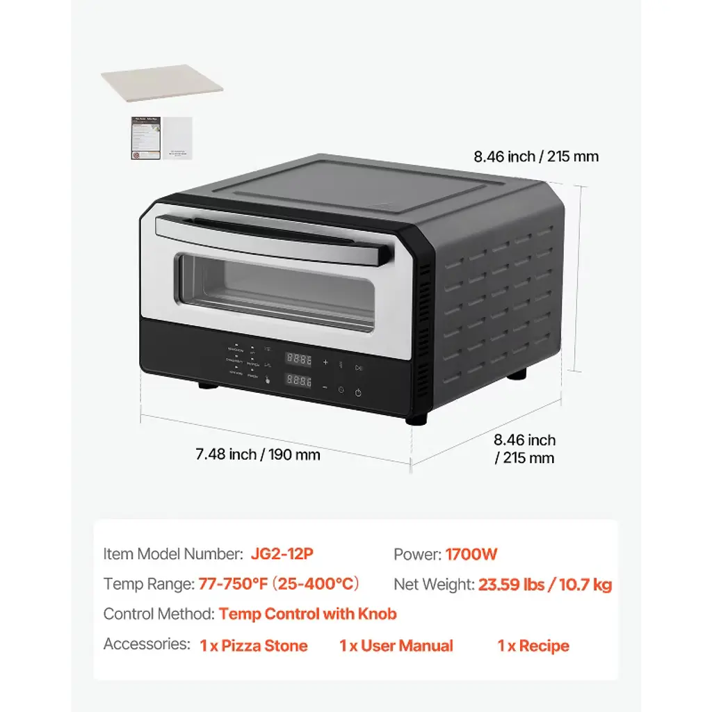 Feature: 12 Inch Multifunctional Electric Pizza Oven: This electric pizza oven supports fast high-heat cooking up to 750℉ and offers 5 pizza presets. It also handles broiling, baking, proofing, and warming, ideal for home dinners, parties, and takeout prep. 2-Minute Artisan Pizza: Our pizza oven heats up to 750℉ with 1700W high power and dual heating element, no flipping needed. Enjoy restaurant-style crispy crust and balanced texture in just 2 minutes. Independent Top & Bottom Heat Control: The upper and lower heating tubes can be adjusted separately, allowing you to set the ideal heat for different types of pizzas or foods, resulting in more precise and optimal baking performance. 5 Pizza Presets: This pizza maker features classic pizza modes (Pan, Thin & Crispy, Neapolitan, Frozen, New York). Preset temps and times make mouth-watering pizza easy for beginner, make baking fun and simple. Simple Touch Control Panel: Intuitive touch buttons let you easily set mode, temperature, and time. Clear, user-friendly interface makes operation effortless. Package Content: 1 x Pizza Oven 1 x Pizza Stone 1 x User Manual 1 x Recipe