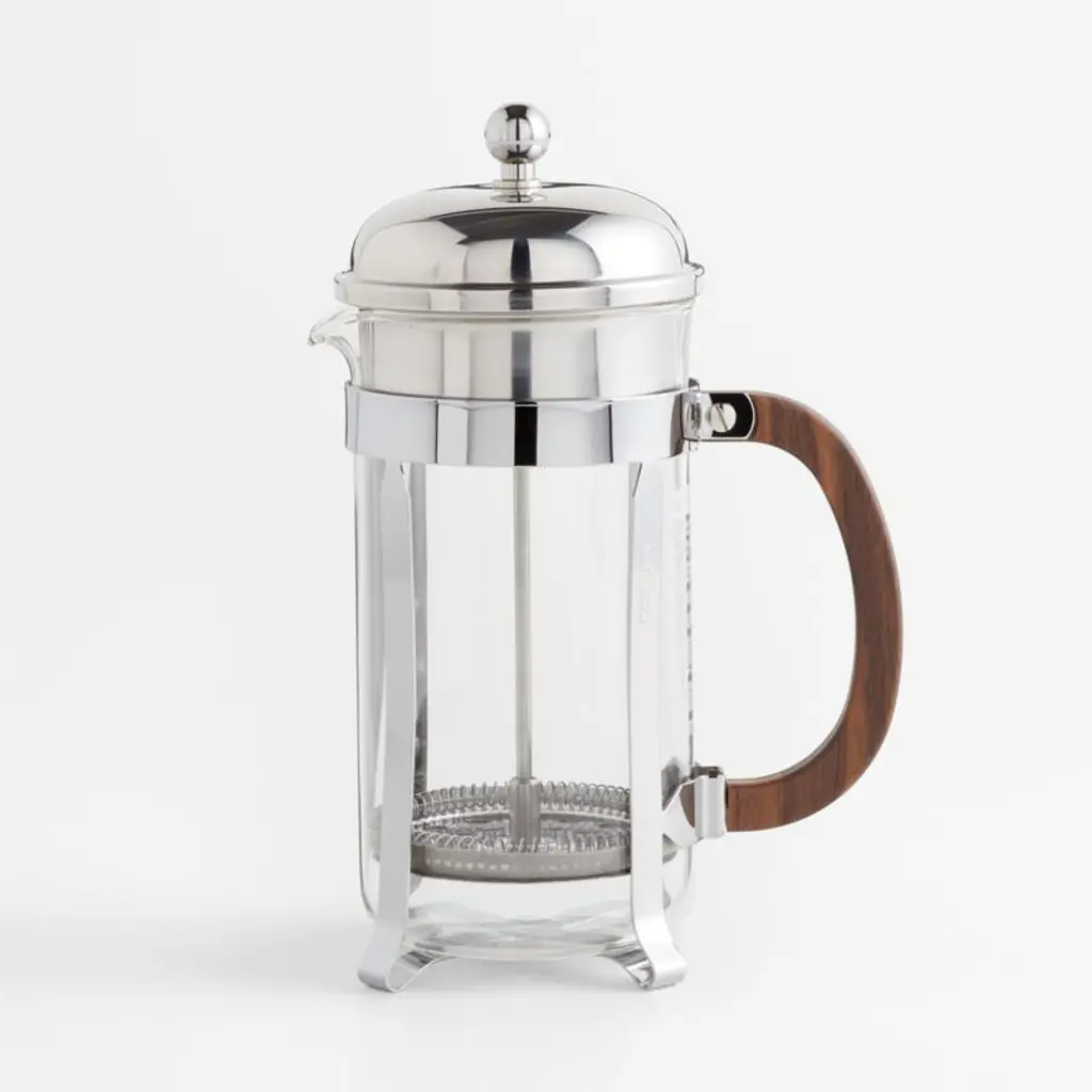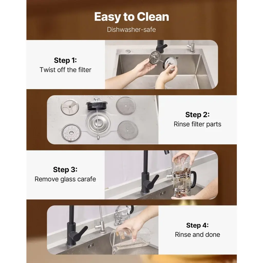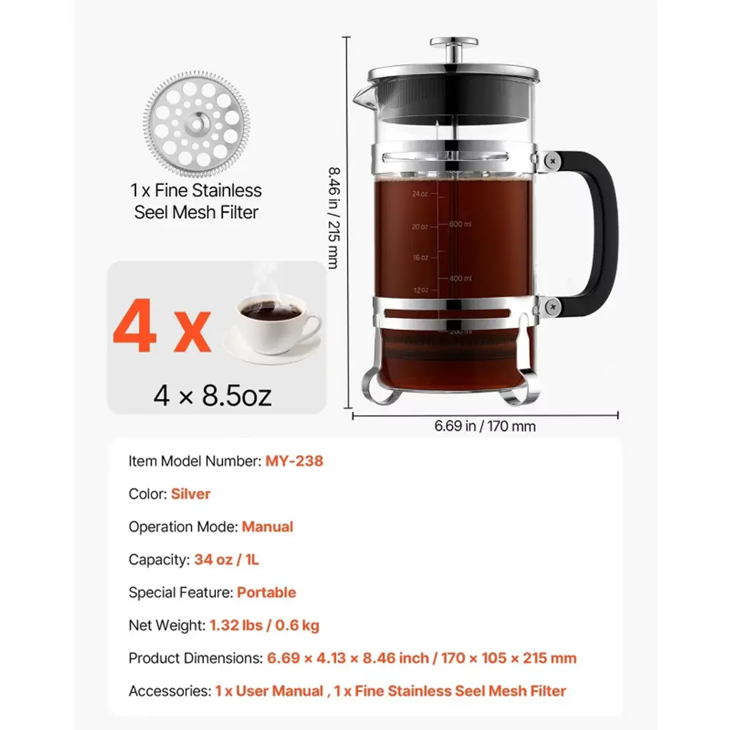 Feature: Clear Glass: Made of premium borosilicate glass, this French press coffee maker is heat-resistant, impact-resistant, and crystal clear—letting you enjoy the full brewing process with improved visibility and experience Precision Filtration System: Our coffee press features a fine filtration system with a 304 stainless steel spiral plate, mesh filter, and cross plate. It effectively removes coffee grounds for a smooth taste Easy Brewing Experience: This glass French press features a simple press-down design that lets you brew rich coffee in just minutes. Clear markings ensure accurate dosing, while the ergonomic, non-slip handle provides effortless and stable pouring Easy to Clean: This French coffee press features a smooth glass surface, removable filter and plunger for effortless cleaning. All parts disassemble easily for deep cleaning and are fully dishwasher-safe Versatile & Portable Design: More than coffee—brew tea, cold brew, or frothed milk with this 34 oz / 1L silver French press. Compact yet generous in capacity, ideal for home, office, camping, or sharing with friends and family Package Content: 1 x French Press Coffee Maker 1 x Stainless Seel Mesh Filter 1 x User Manual