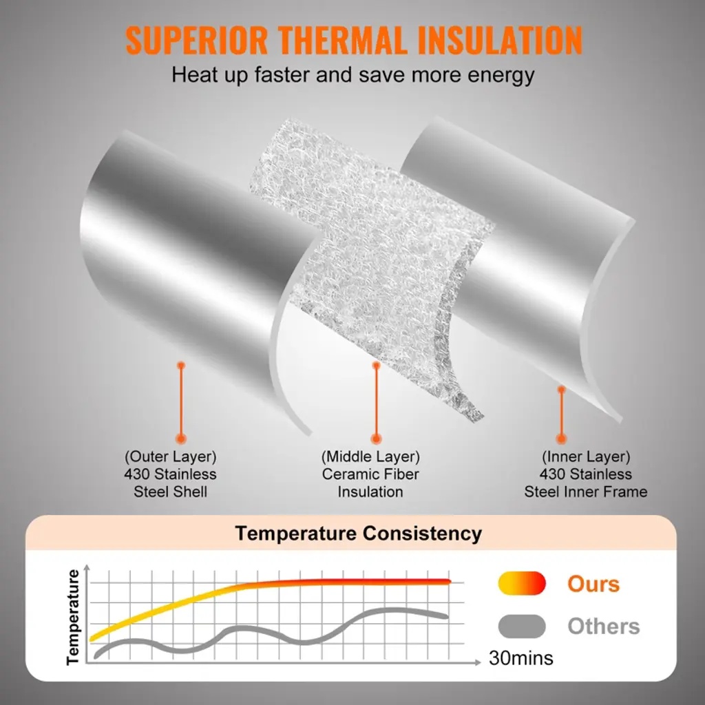 Feature: Efficient Baking: Preheat in 15 minutes, bake in 90 seconds, with temperatures reaching up to 1000°F / 540℃. Suitable for baking 12-inch pizzas and cooking various meats, fish, and vegetables. Gas Powered: Gas-powered pizza oven with knob control for ignition, offering higher efficiency and convenience. No need to handle fuel waste, clean and easy. Insulating Material: Ceramic fiber insulation cotton placed between double-layer insulation materials in the oven ensures more even heat distribution, reduces heat loss, promotes faster heating, and achieves higher temperatures. Easy to Carry: Foldable legs for easy transport to various outdoor locations. Includes a pellet spoon and storage bag accessories. Simple Operation: Connect the gas tank, turn on the switch, preheat the pizza oven, place the pizza inside, occasionally rotate to prevent burning, and enjoy your meal. Package Content 1 x Outdoor Pizza Oven 1 x Pizza Stone 1 x Cover 1 x Instruction Manual