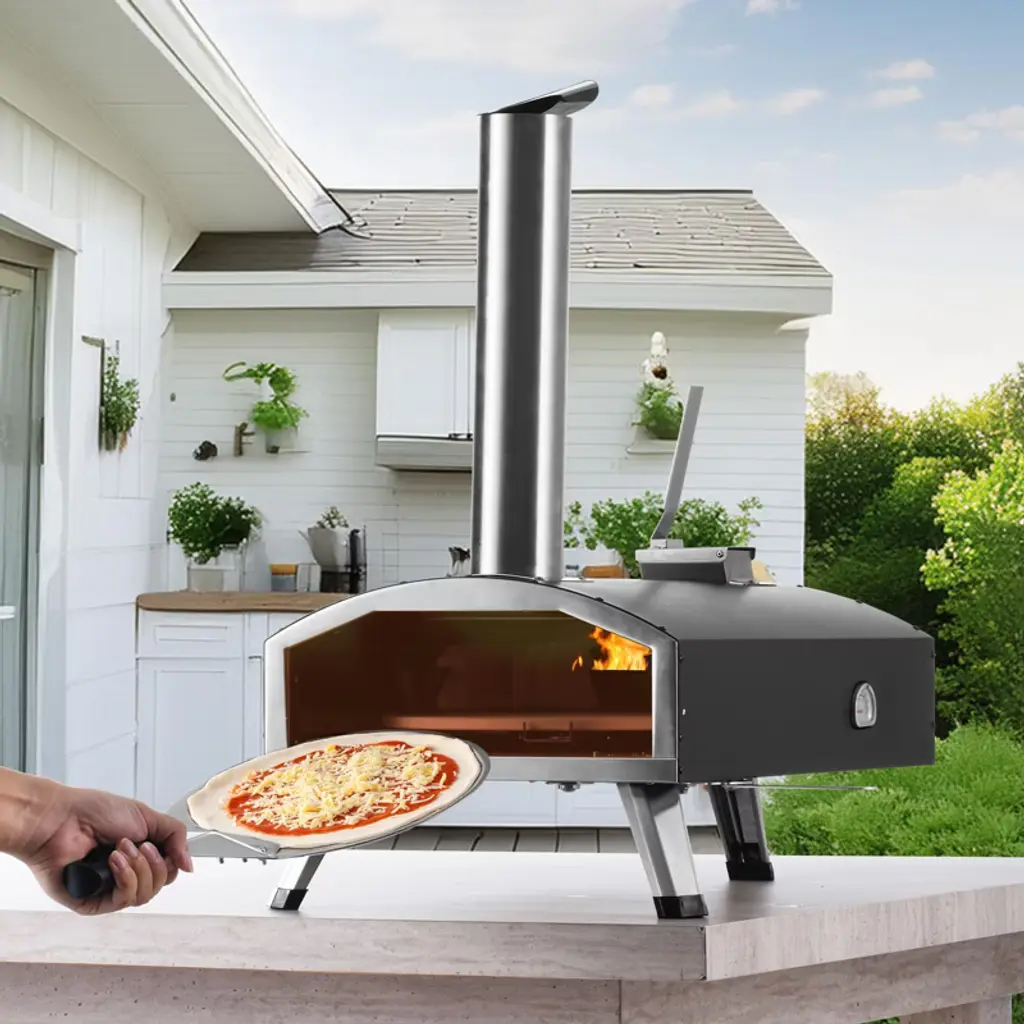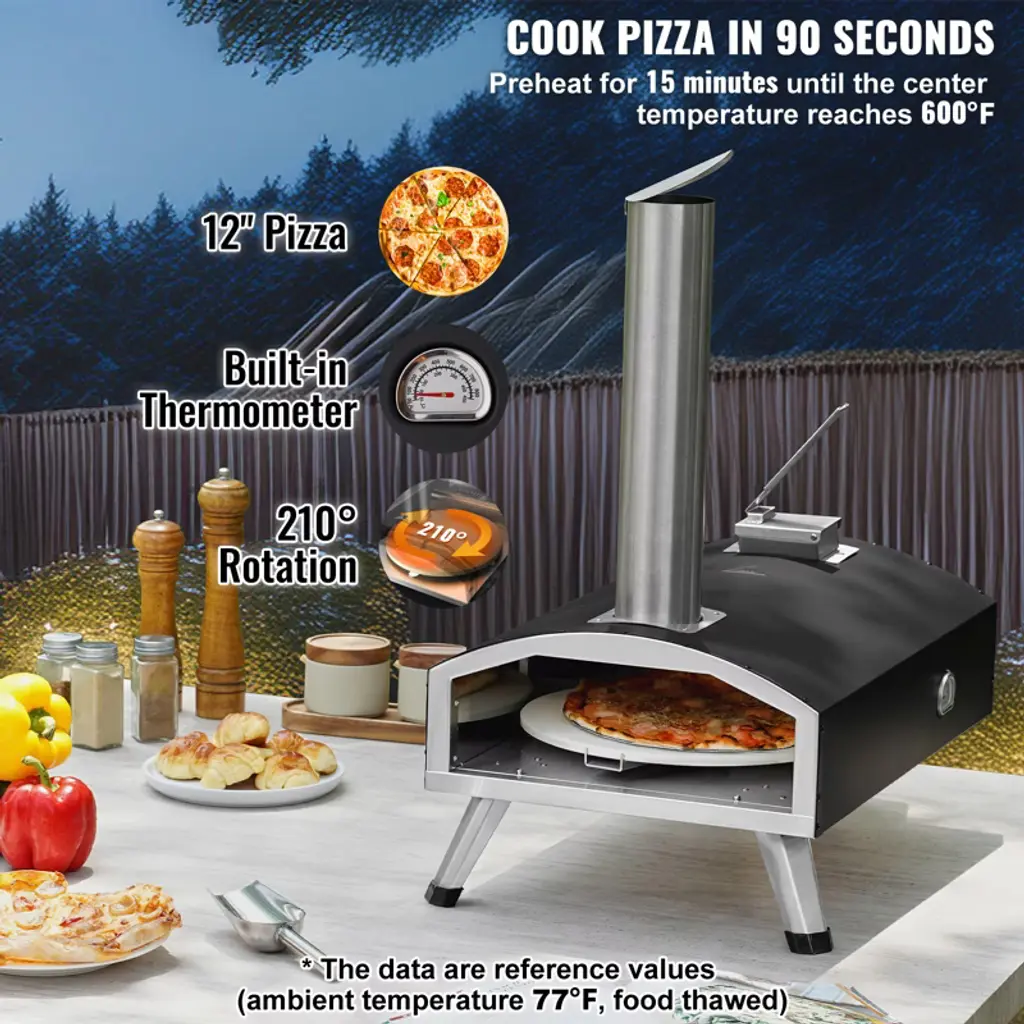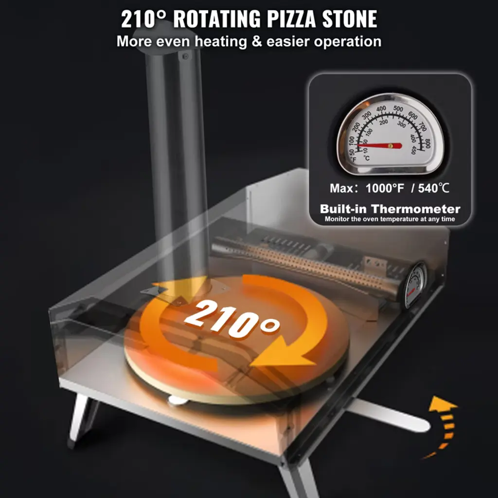 Feature: Efficient and Even Baking: Preheat in 15 minutes, bake in 90 seconds, with temperatures reaching up to 1000°F / 540℃. The 210° rotating pizza stone ensures uniform baking without the need to frequently remove the pizza to rotate, making the baking process more even. Ideal for baking 12-inch pizzas and cooking various meats, fish, and vegetables. Multiple Fuels: Wood pellets, wood chips, and charcoal can all be used as fuel. Featuring a 450g large-capacity fuel funnel and separate feed port, reducing the need for mid-session refueling, making it easy to add and handle fuel pellets. Insulated Materials: Stainless steel 430 inner frame, cold-rolled plate shell, minimizing heat loss for faster heating and higher temperatures. Upgraded thickened cordierite pizza stone packaging reduces transportation damage. Easy to Use and Carry: Comes with a built-in thermometer for monitoring internal temperatures. Foldable legs for portability, lightweight for use in various outdoor settings. Includes a pellet spoon and storage bag accessories. Simple Operation: Load fuel, ignite, preheat the pizza oven, place the pizza inside, occasionally rotate by hand to prevent scorching, and enjoy your meal. Package Content 1 x Outdoor Pizza Oven 1 x Pizza Stone 1 x Pellet Scoop 1 x Chimney Pipe 1 x Instruction Manual