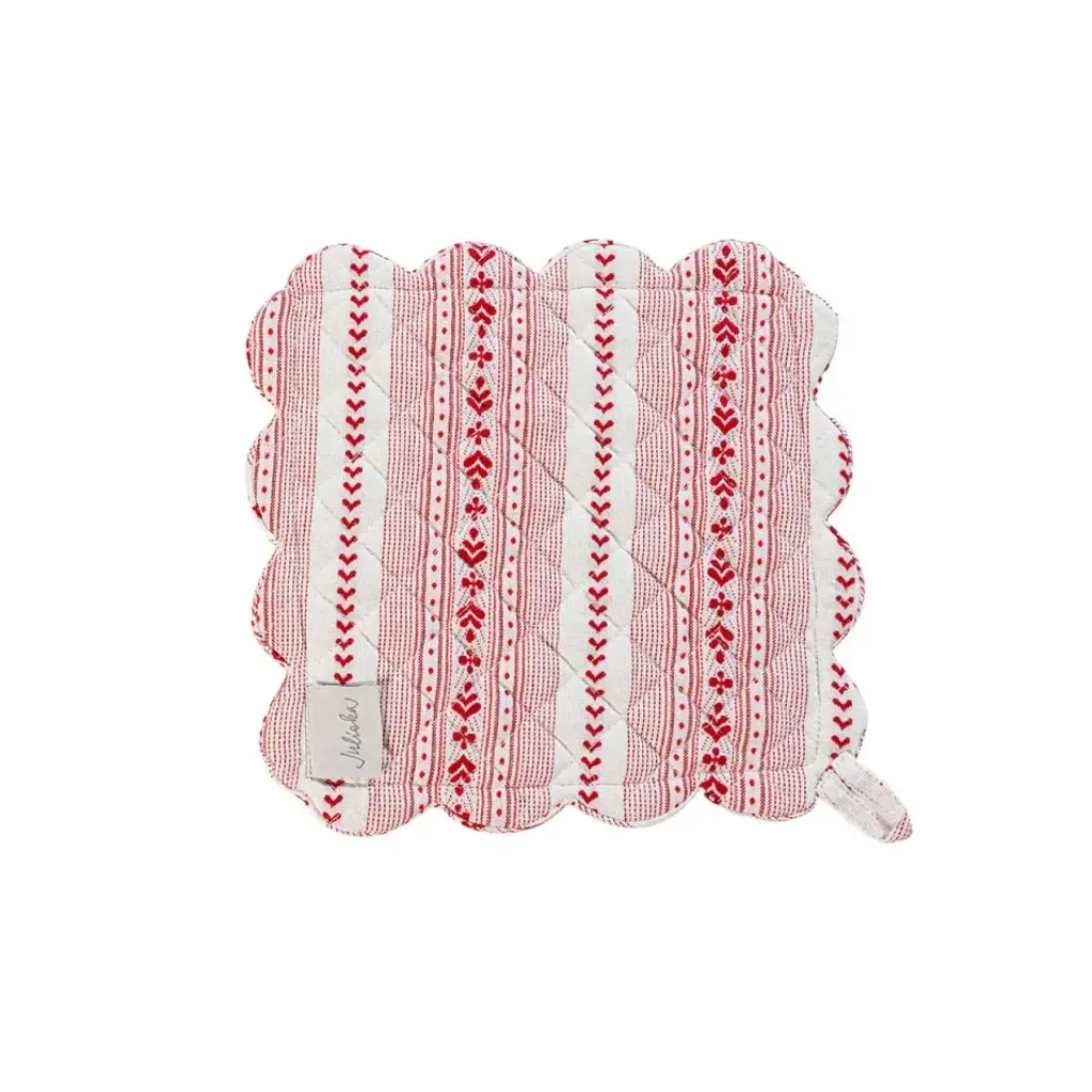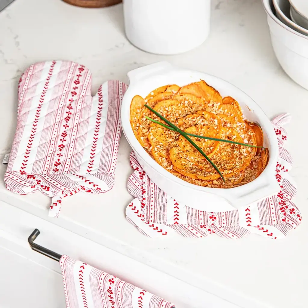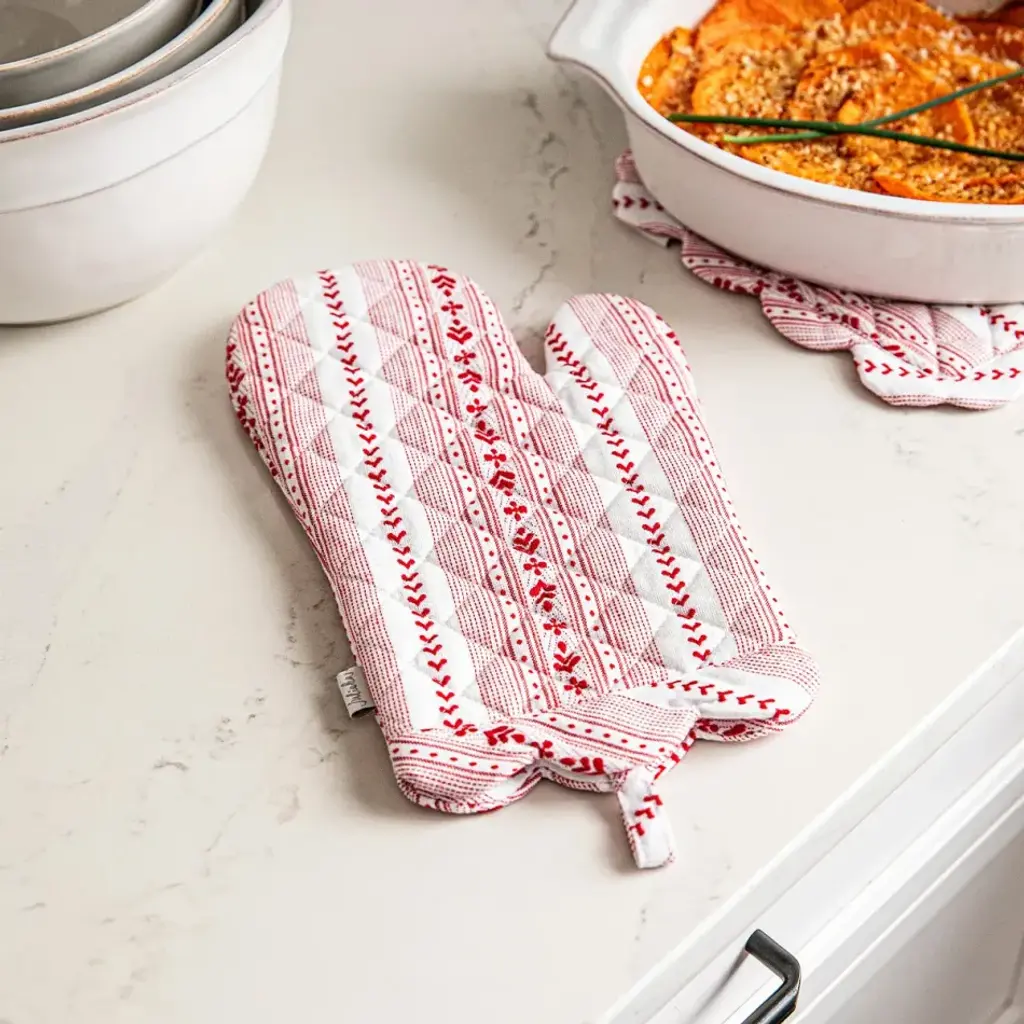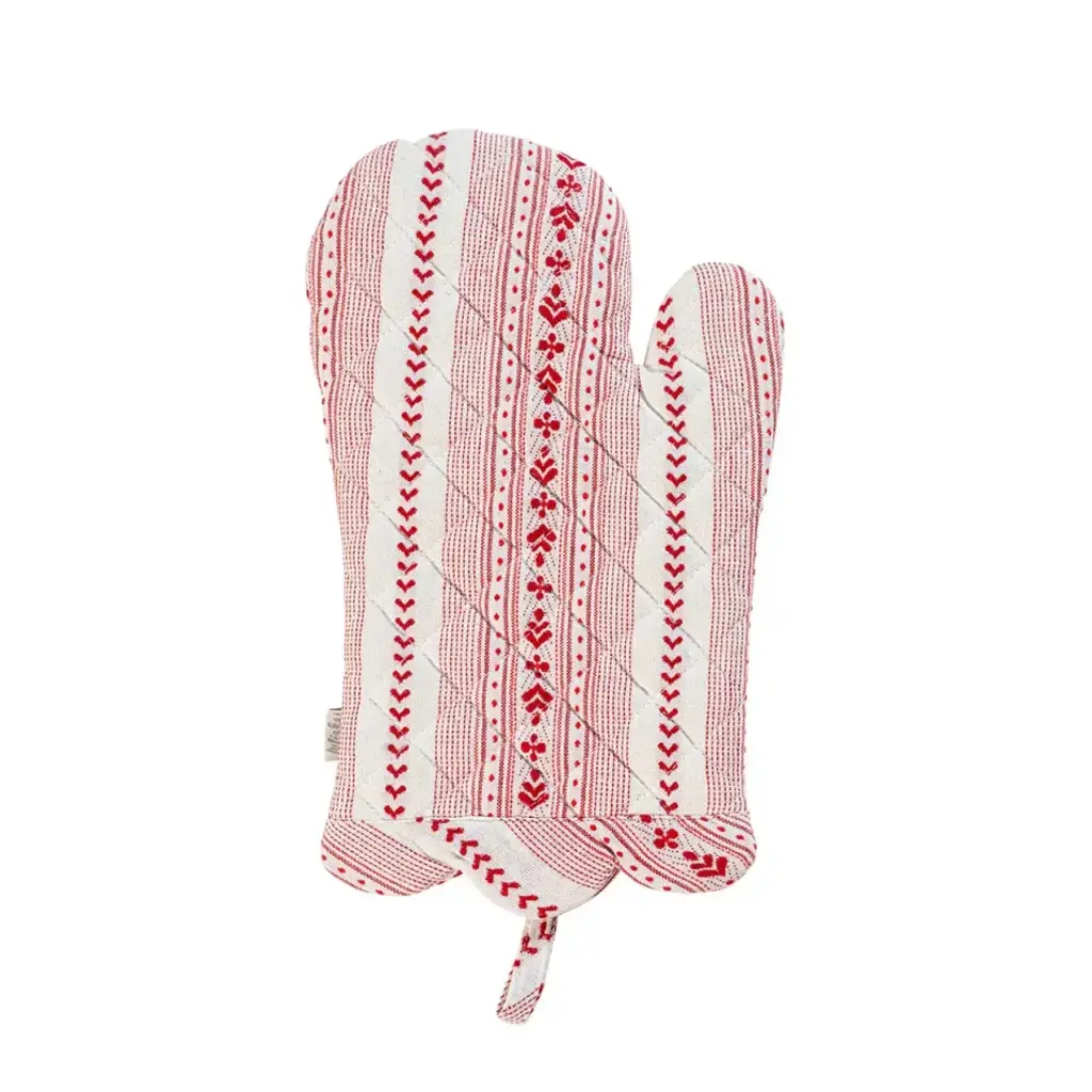 For the consummate hostess, a matching oven mitt and pot holder to complete the Villa Stripe collection, with its red and cream jacquard stripe. Fabulous for holiday entertaining, baking, and gifting! Based in Connecticut, Juliska is committed to bringing elegant European design into our modern homes. Since its founding in 2001, when David and Capucine Gooding began by working with artisans outside of Prague to reproduce antique Bohemian glass pieces, every piece from Juliska has shared a rich heritage spanning six centuries of European design. Juliska's creations are timeless, romantic and effortlessly chic.