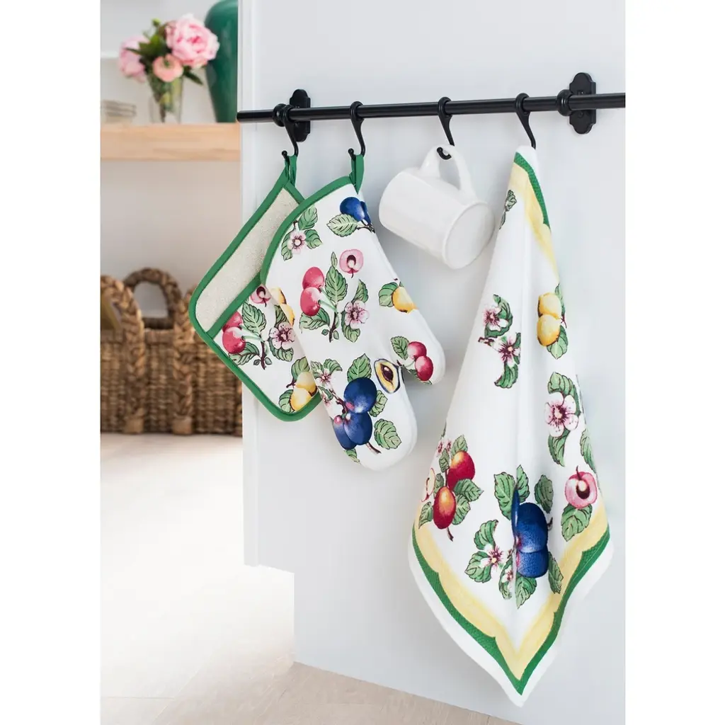 Villeroy & Boch is a trusted international lifestyle brand, offering sophisticated tabletop and home décor products that showcase European design and expertise. The traditional French Garden collection features brightly colored florals and fruit complemented by green and yellow accents on a white ground. Matte cotton print exterior and beige terry cloth interior for comfort and functional use. Sold as a single oven mitt, measuring 13x6. 100% fine cotton. Easy care, machine washable. Coordinate to the entire French Garden collection.