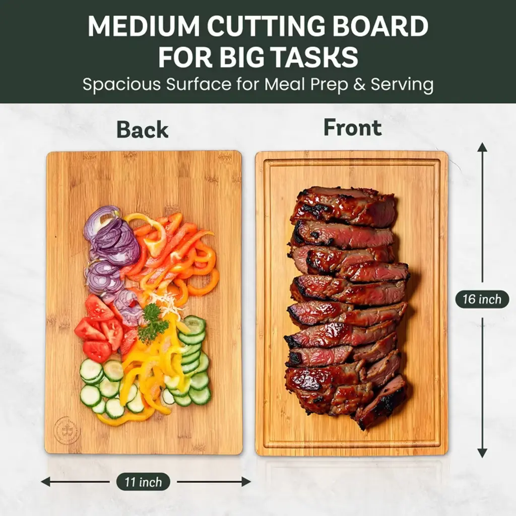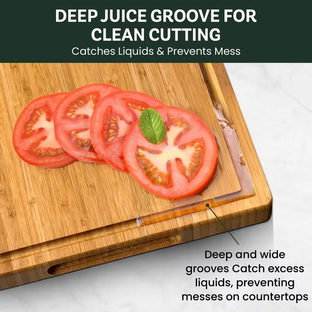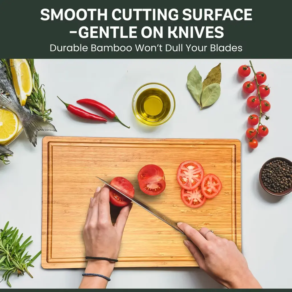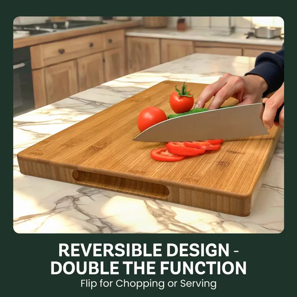 Premium Bamboo Cutting Board for the Modern Home Elevate your kitchen with our stunning bamboo cutting board, perfect for cooking enthusiasts, entertainers, and those who appreciate eco-friendly living. This beautifully crafted board is designed for durability, functionality, and style. Features: - Durable Bamboo Construction: Made from high-quality, sustainably sourced bamboo for long-lasting performance. - Juice Groove: Conveniently designed with a juice groove to catch liquids and prevent messes. - Easy to Clean: Smooth, non-porous surface wipes clean easily and resists scratches. - Variety of Sizes: Available in multiple sizes to suit your needs, from compact to large.