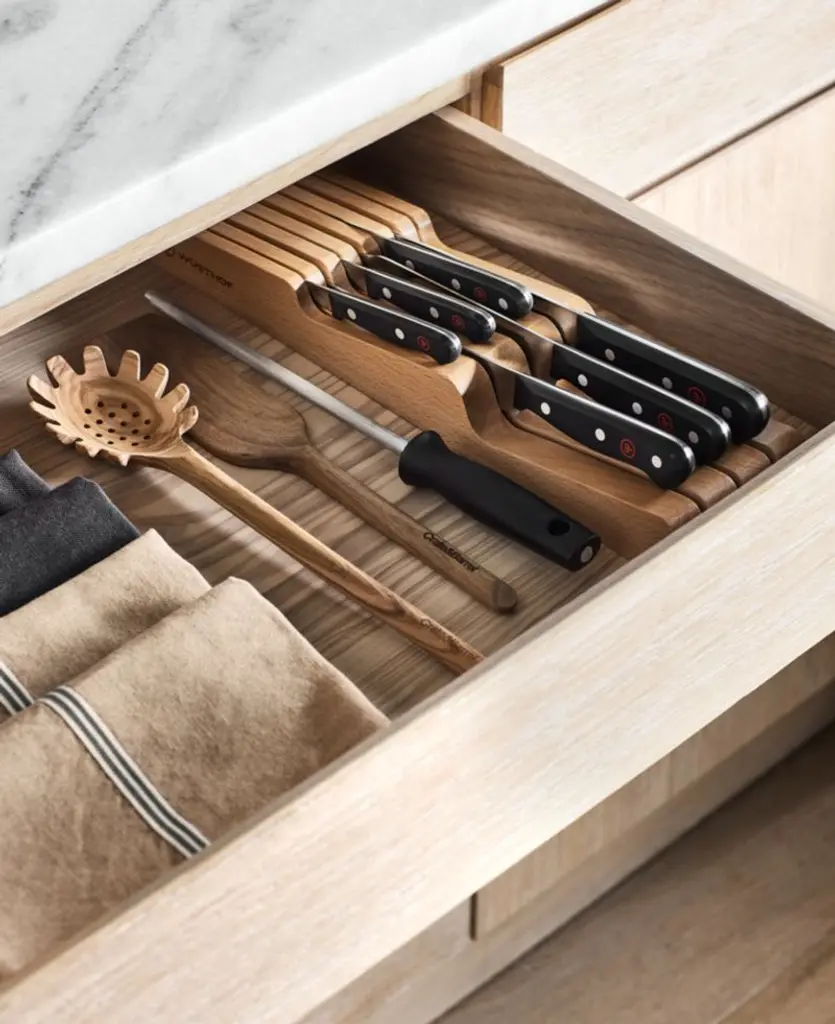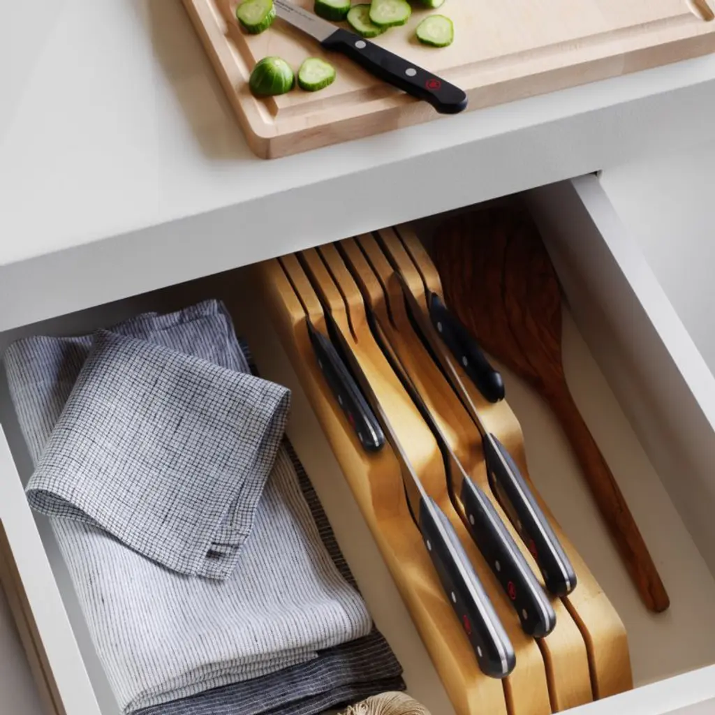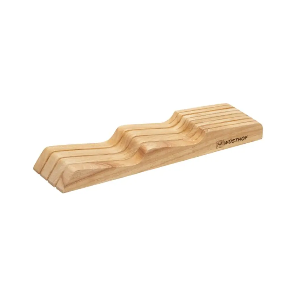 One of the most trusted names in cutlery, Wüsthof® offers the perfect knife for every cutting, chopping and slicing job. Strong, long-lasting blades are precision-tapered from bolster to tip to maintain their shape and hold their edge. Blades are laser-cut from a single piece of steel and easy to sharpen. Full tang adds weight and balance to blades longer than 5". Knives feature high-impact, molded synthetic handles that are comfortable to hold, more durable and sanitary than wood. Low-profile rubberwood knife tray with seven slots takes cutlery off the counter and stows it neatly in a drawer.Produced by skilled craftspeople in the knife-producing capital of the world, Wüsthof cutlery has been crafted in Solingen, Germany, for over 200 years. Need help choosing? Here's your essential guide to choosing the best knife