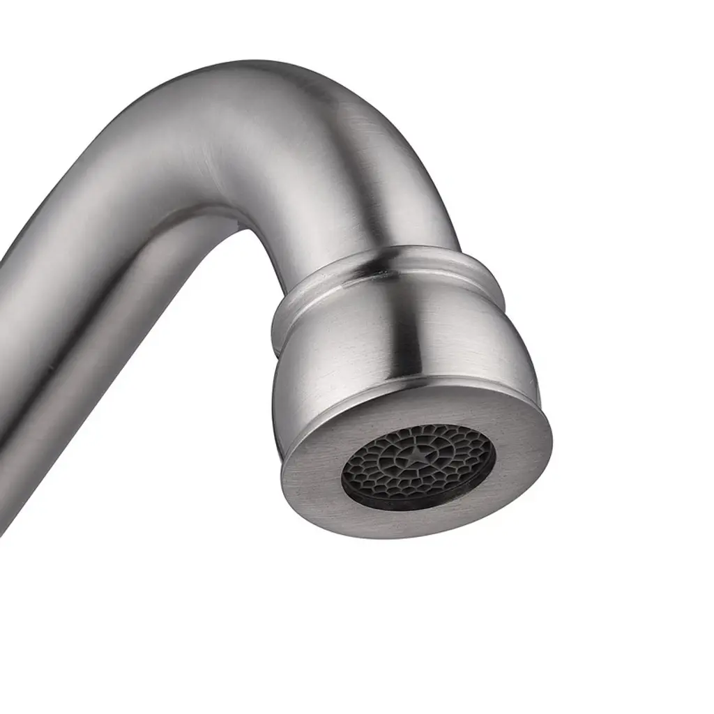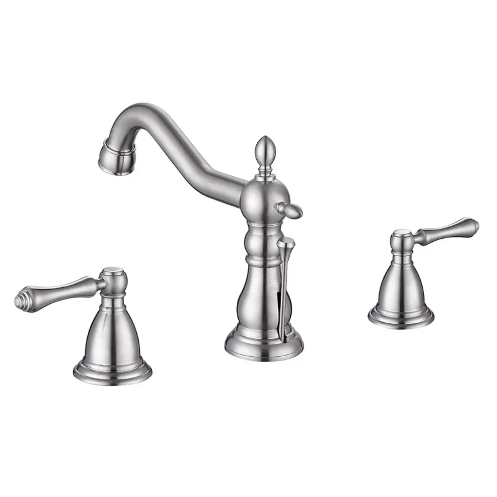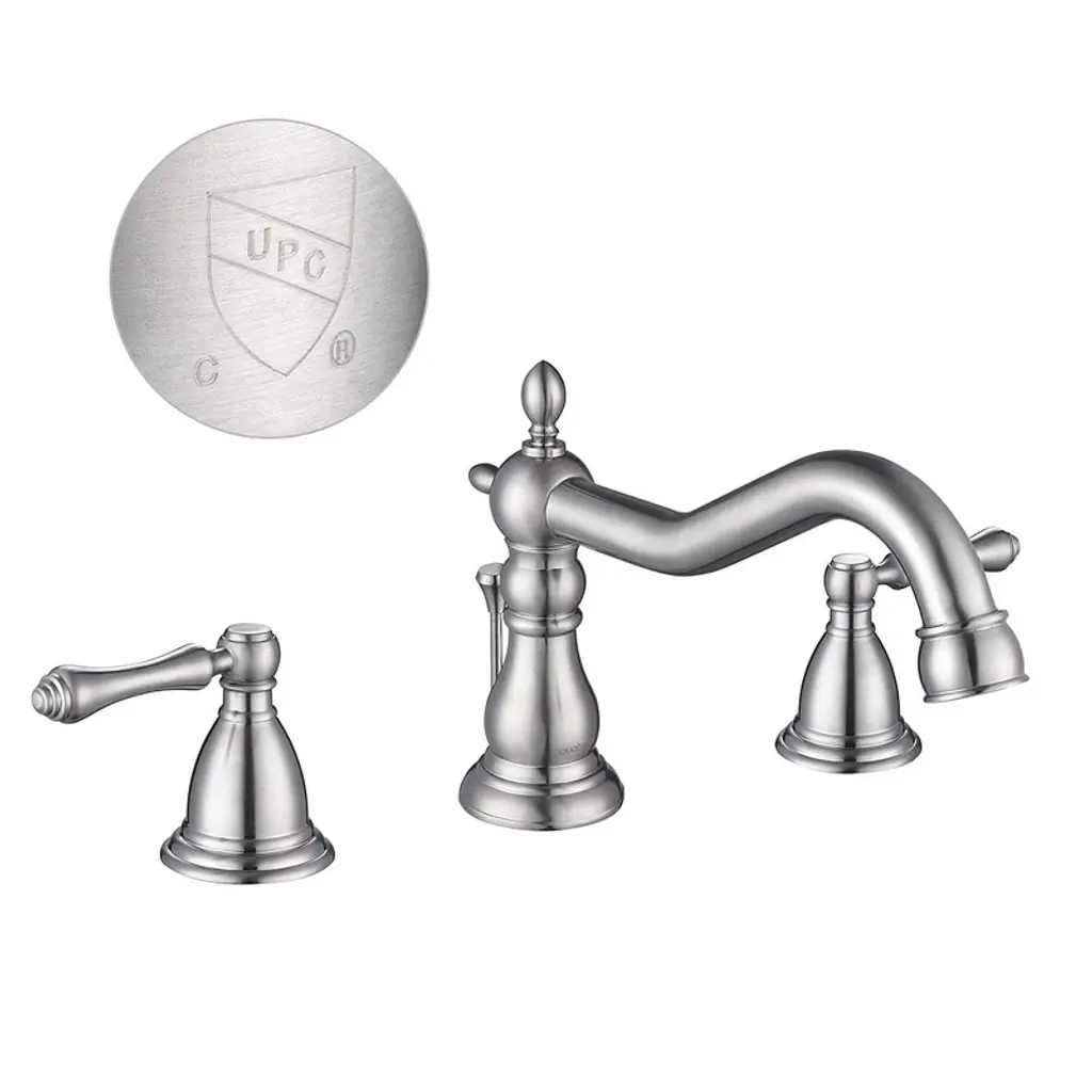 Features:- Vintage Style - Aquaterior Widespread 3 Hole Bathroom Faucet is designed with a vintage long spout style that fits for large sinks, adding a vintage and elegant look to your bathroom, and is compatible with different types of undermount and wall mounted sink- Install in Minutes - Comes with special Square Nuts on the handles and a Hex Nut on the faucet for manually screwing and easy DIY installation, allowing tool-free installation within minutes- Convenient 2 Handles - Features 2 separate handles for hot and cold water adjusting and water flow control for your convenience (2.2 GPM at 60 PSI max flow rate); Also includes a lever-controlled drain for easy water draining- Leak-free & Durable - Features a brass body with brushed nickel plating for smooth touching, while offering rust and wear-and-tear resistance, along with an upgraded ceramic valve that is leakproof and supports 500,000 times of opening & closing, ensuring prolonged and frequent use- Water Saving & Safe - Being CEC certified, it provides the experience of high water flow while maintaining a flow rate below 2.2 GPM, along with CUPC and NSF certifications for quality assurance and safe usage; Comes with 5 years warranty for your peace of mindSpecifications:- Faucet:- Overall Dimension(Thread Excluded) (WxDxH): 2 3/16" x 9 1/16" x 5 11/16"- Faucet Thread Diameter: 1/2"- Faucet Required Pre-drilled Hole (Dia.): 9/16" x 1 3/4"- Spout Diameter: 5/8"- Spout Reach: 6 1/8"- Spout Height: 3 9/16"- Handle: - Handle Dimension(Thread Excluded) (WxDxH): 2 1/16" x 3 15/16" x 2 3/4"- Handle Thread Diameter: 1 1/16"- Handle Required Pre-drilled Hole (Dia.): 1 1/8" x 1 3/4"- Pipes Size(Dia. x L): 3/8" x 11"- Pipes Thread Diameter: 3/4"- Suitable Deck Thickness Range: 3/16" x 1 3/8"- Body Material: Brass- Handle Material: Zinc Alloy- Net Weight: 4.52 LbsPackage Contents:- 1x Faucet- 2x Faucet Handles- 1x Faucet Accessary- 1x Drain- 1x Drain Accessary- 2x Cold & Hot Hoses- 1x Manual
