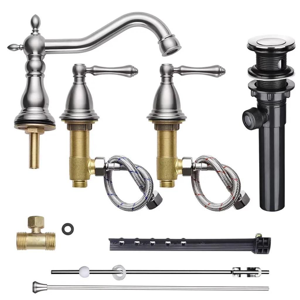 Yescom Retro 3 Hole Bathroom Faucet Widespread Mixer Taps For Undermount Sink W/drain Nickel Brushed Nickel
