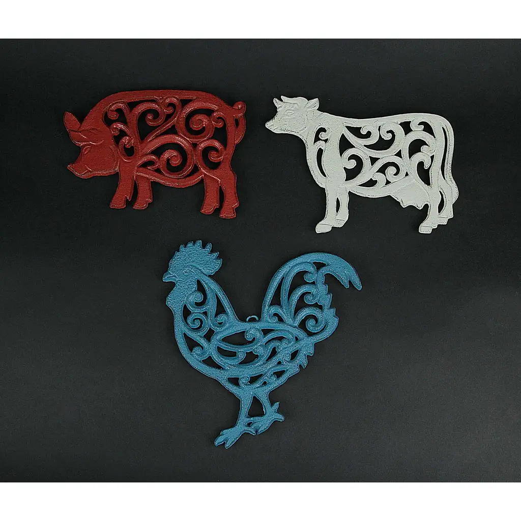 Zeckos Cast Iron Cow Pig And Rooster Kitchen Trivets (Set Of 3) - 0.5 X 9.5 X 9 Inches - Multi-Color - 0.5 X 9.5 X 9 Inches