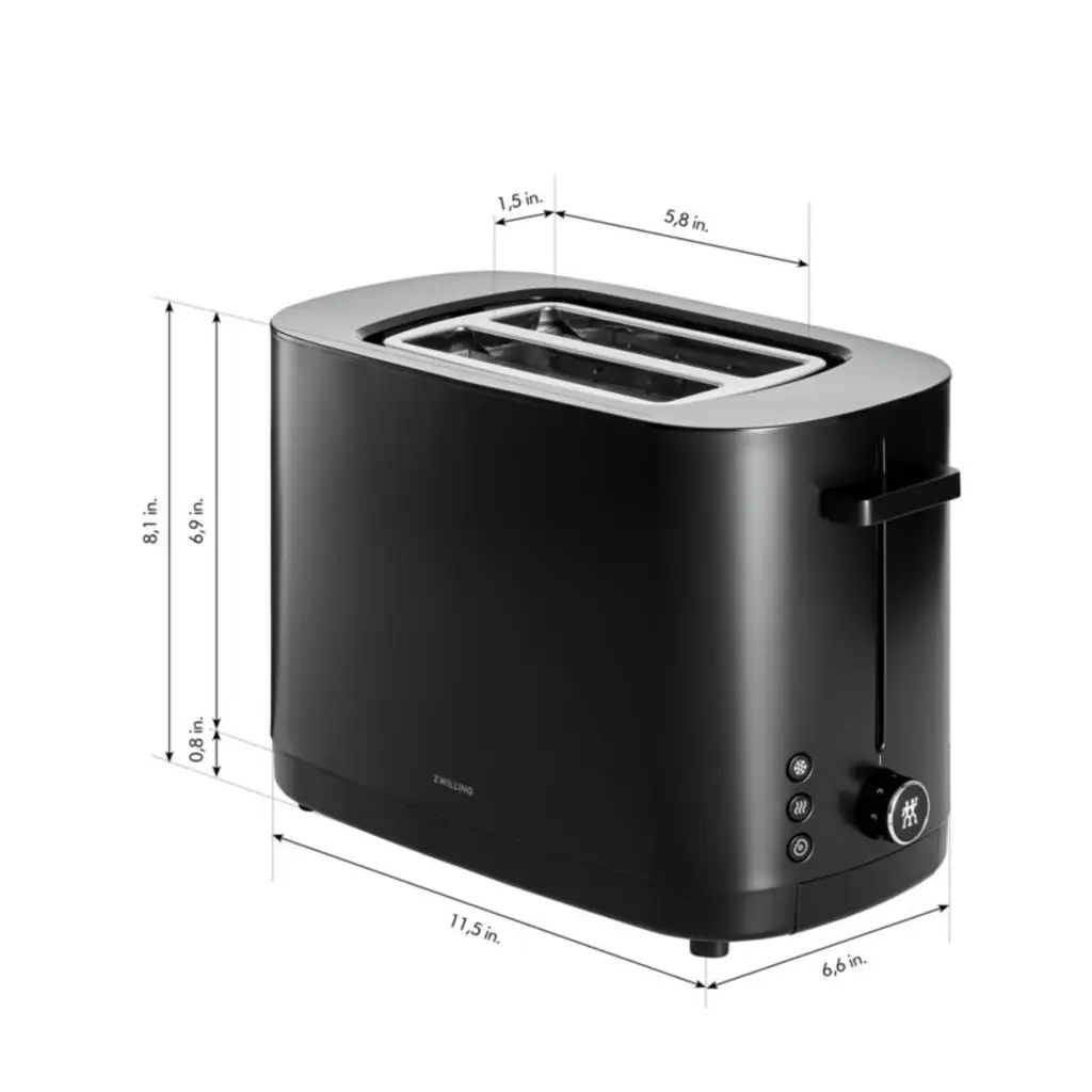 With its sleek design and modern matte black finish, this toaster takes pride of place on the contemporary countertop. Two separate heating elements for each of the toaster's two slots deliver balanced heat distribution so that every slice of bread is evenly toasted, on both sides, while the toaster's exterior stays cool to the touch. Seven browning modes toast to suit your preference, and the soft-lift feature ensures that bread slices, English muffins and toaster pastries glide up gently for easy removal. View all Zwilling J.A. Henckels products