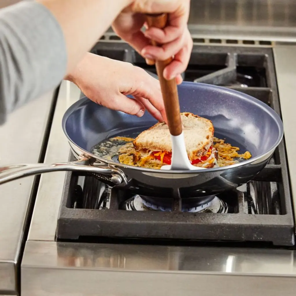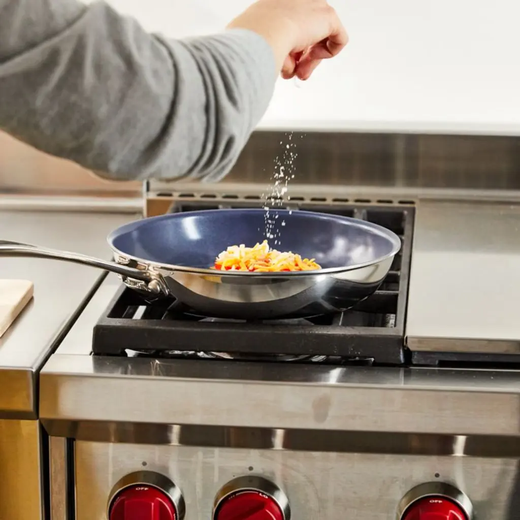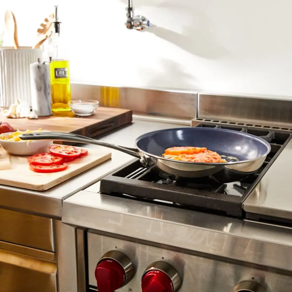 Brown, saute and fry with this essential pan. The fry pan features an aluminum core clad in stainless steel for quick and even heating. Finished with an ultra-durable ceramic non-stick coating in deep blue, this oven-safe pan releases latkes, fried eggs and veggie burgers with ease then cleans up quickly in the dishwasher. The stay-cool handles offers safety, comfort and usability