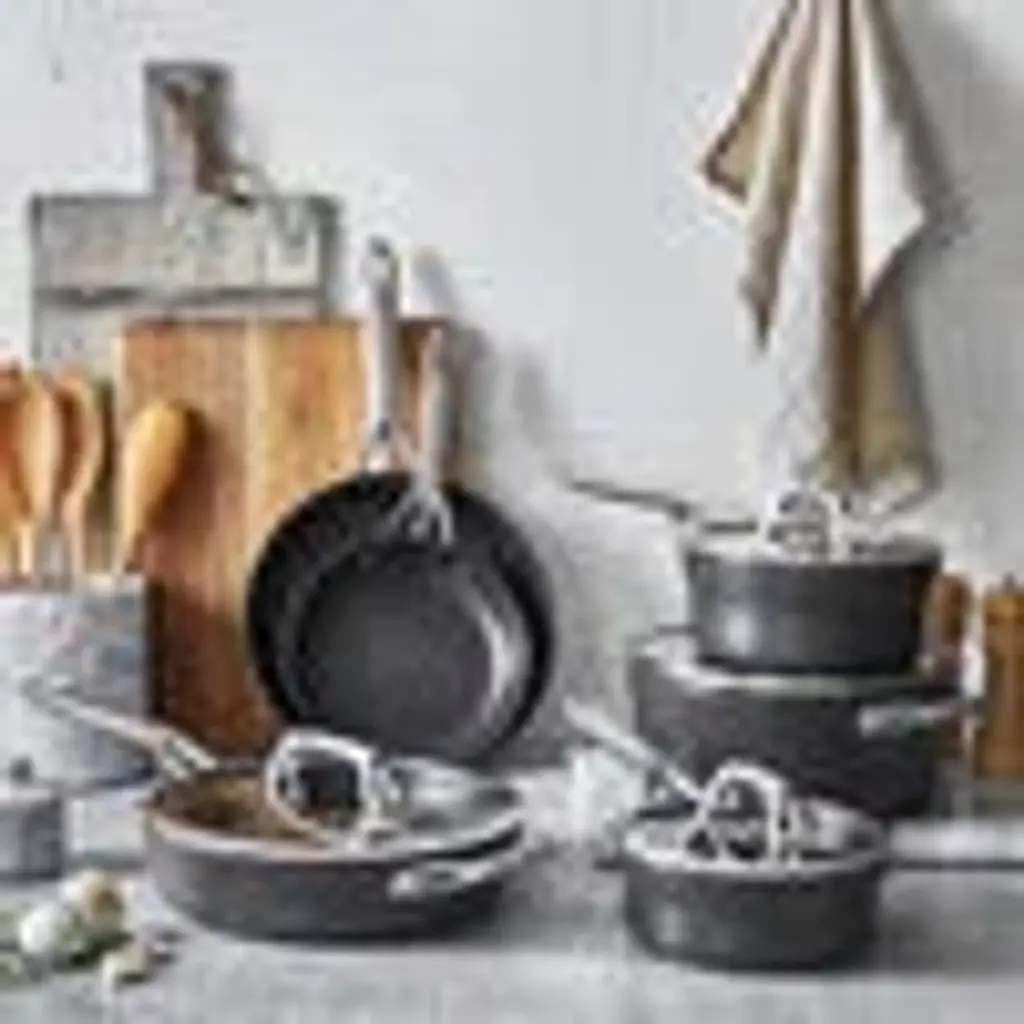 In this perfect pairing, chefs benefit from the high performance of heavy-gauge anodized aluminum and the convenience of nonstick coating. The multi-layer PFOA-free nonstick coating offers effortless release and quick cleanup. Combined with the durable aluminum construction that ensures even heating, these versatile pots and pans are perfect for all cooking techniques from searing to sautéing. The tight-fitting tempered glass lids let you monitor your cooking while the double-riveted stay-cool handles are designed for maximum maneuverability and dishwasher safe.