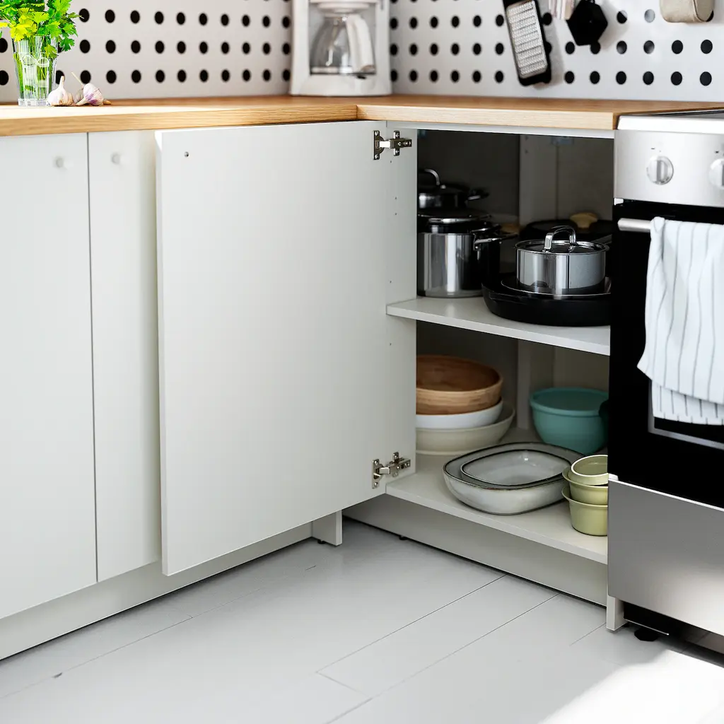 KNOXHULT Base corner cabinet - white 44x24x36 ". White fronts paired with oak effect worktop gives the kitchen a fresh and timeless expression that is easy to like. Makes good use of corner spaces, providing extra depth for working and roomy storage for larger pots and pans.