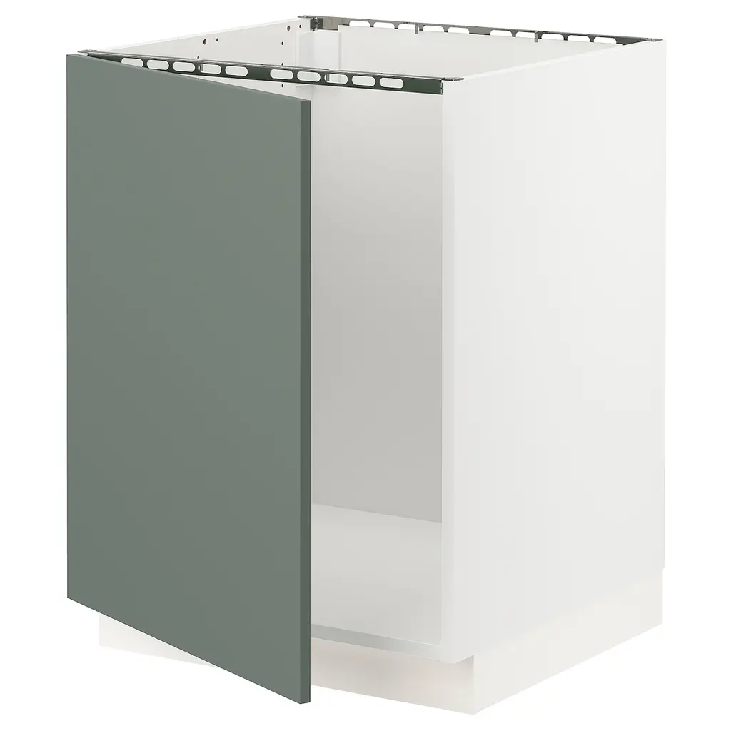 SEKTION Base cabinet for sink - white/Bodarp gray-green 24x24x30 ". The door can be mounted to open to the left or right. Sturdy frame construction, ¾" thick. The door damper prevents your cabinet door from slamming by catching the moving door so that it closes slowly, gently and silently.