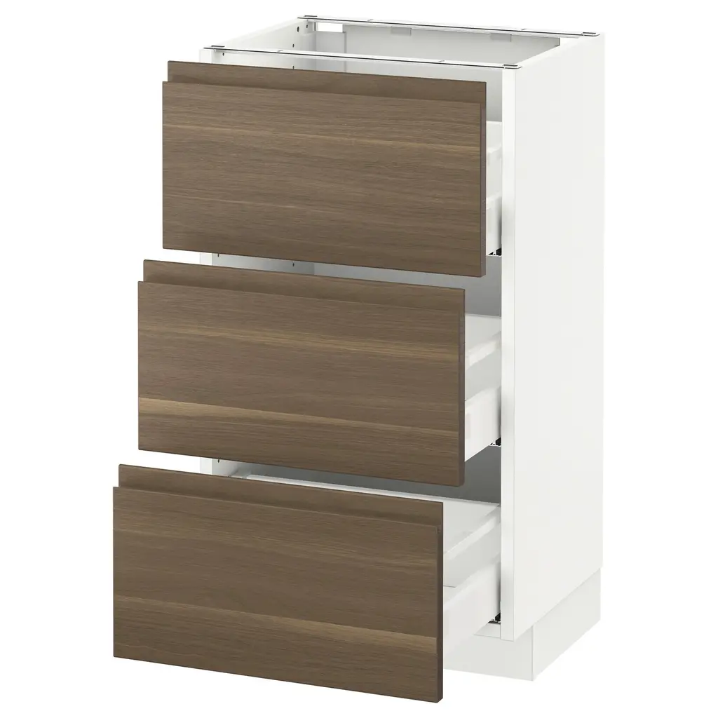 SEKTION Base cabinet with 3 drawers - white Maximera/Voxtorp walnut 18x15x30 ". MAXIMERA drawer is a smooth-running, full-extension drawer with built-in dampers so that it closes slowly, softly, and quietly. Sturdy frame construction, ¾" thick. To be finished with legs and plinth, sold separately.
