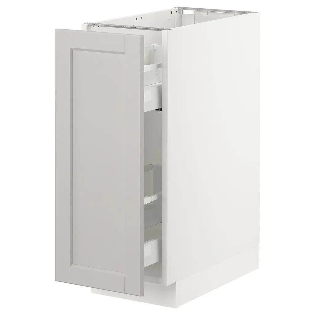 SEKTION Base cabinet with pull-out storage - white/Lerhyttan light gray 12x24x30 ". You can view and access what's inside as the drawer can be pulled out all the way. Sturdy frame construction, ¾" thick. Requires a knob or a handle To be finished with legs and plinth, sold separately.