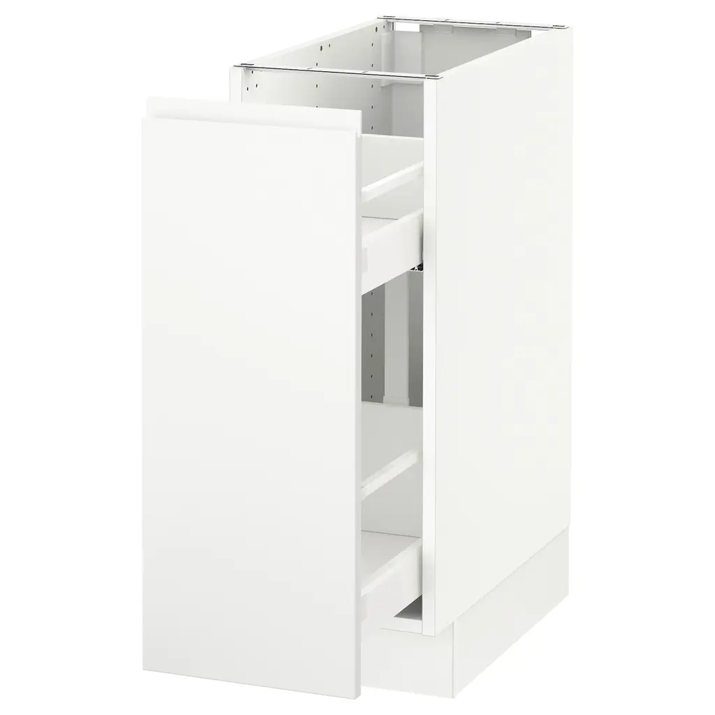 SEKTION Base cabinet with pull-out storage - white/Voxtorp matt white 12x24x30 ". You can view and access what's inside as the drawer can be pulled out all the way. Sturdy frame construction, ¾" thick. To be finished with legs and plinth, sold separately.