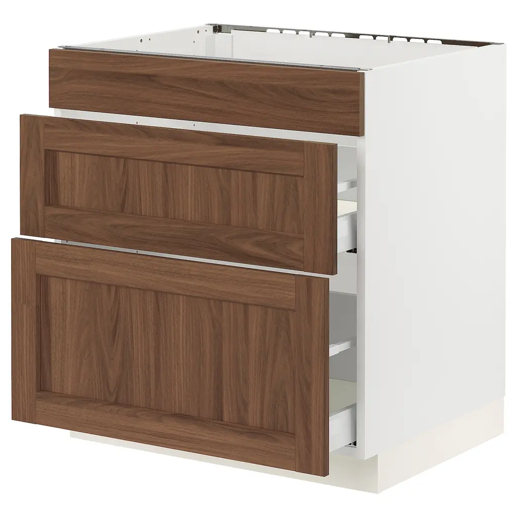 SEKTION / MAXIMERA Base cab f cktp/3 fronts/2 drawers - white Enköping/brown walnut effect 30x24x30 ". MAXIMERA drawer is a smooth-running, full-extension drawer with built-in dampers so that it closes slowly, softly, and quietly. Sturdy frame construction, ¾" thick. Requires a knob or a handle