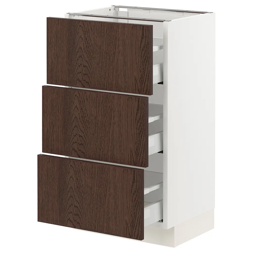 SEKTION / MAXIMERA Base cabinet with 3 drawers - white/Sinarp brown 18x15x30 ". MAXIMERA drawer is a smooth-running, full-extension drawer with built-in dampers so that it closes slowly, softly, and quietly. Sturdy frame construction, ¾" thick. To be finished with legs and plinth, sold separately.