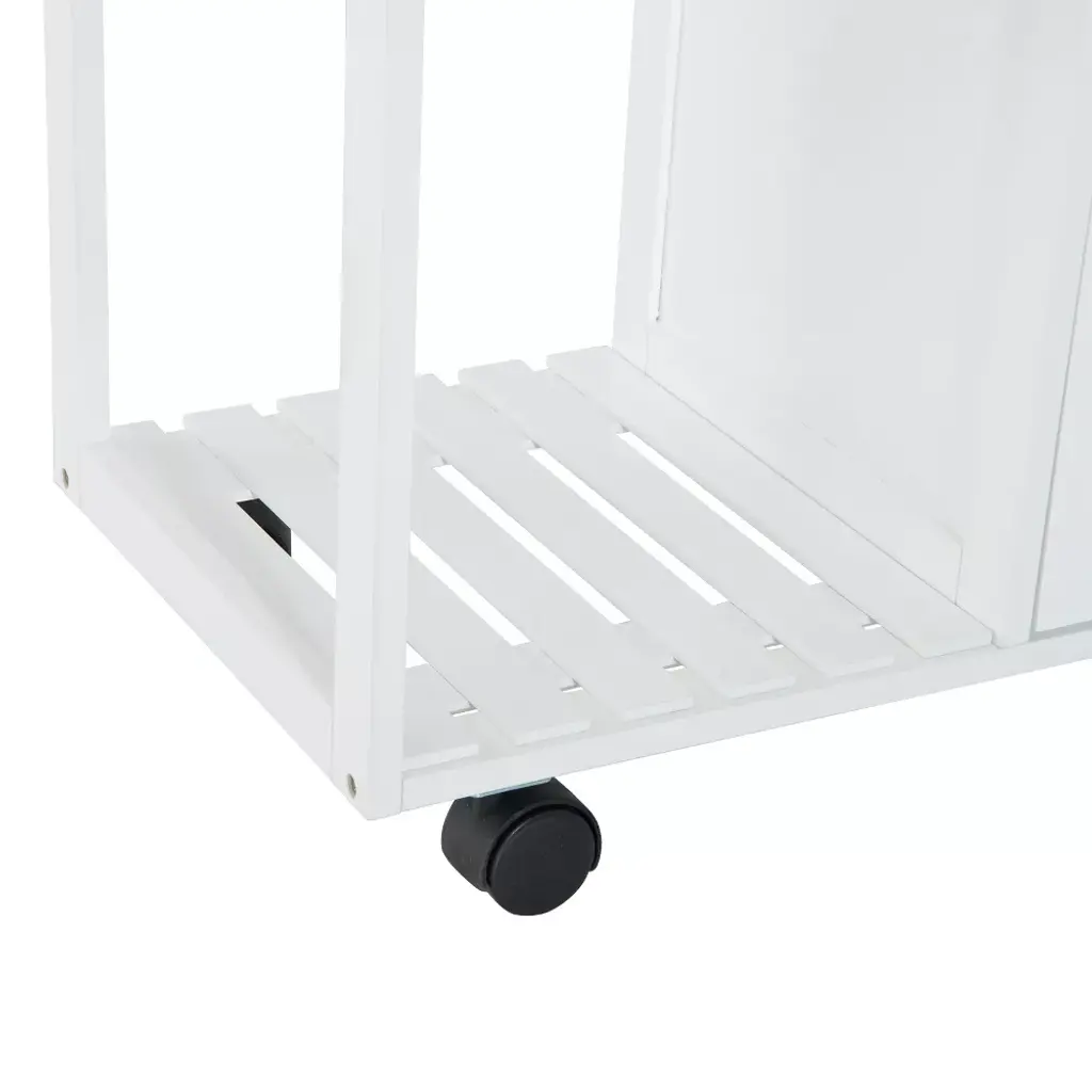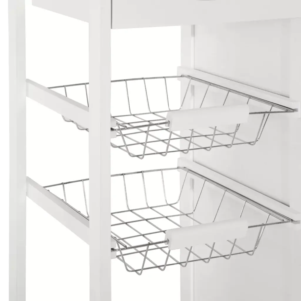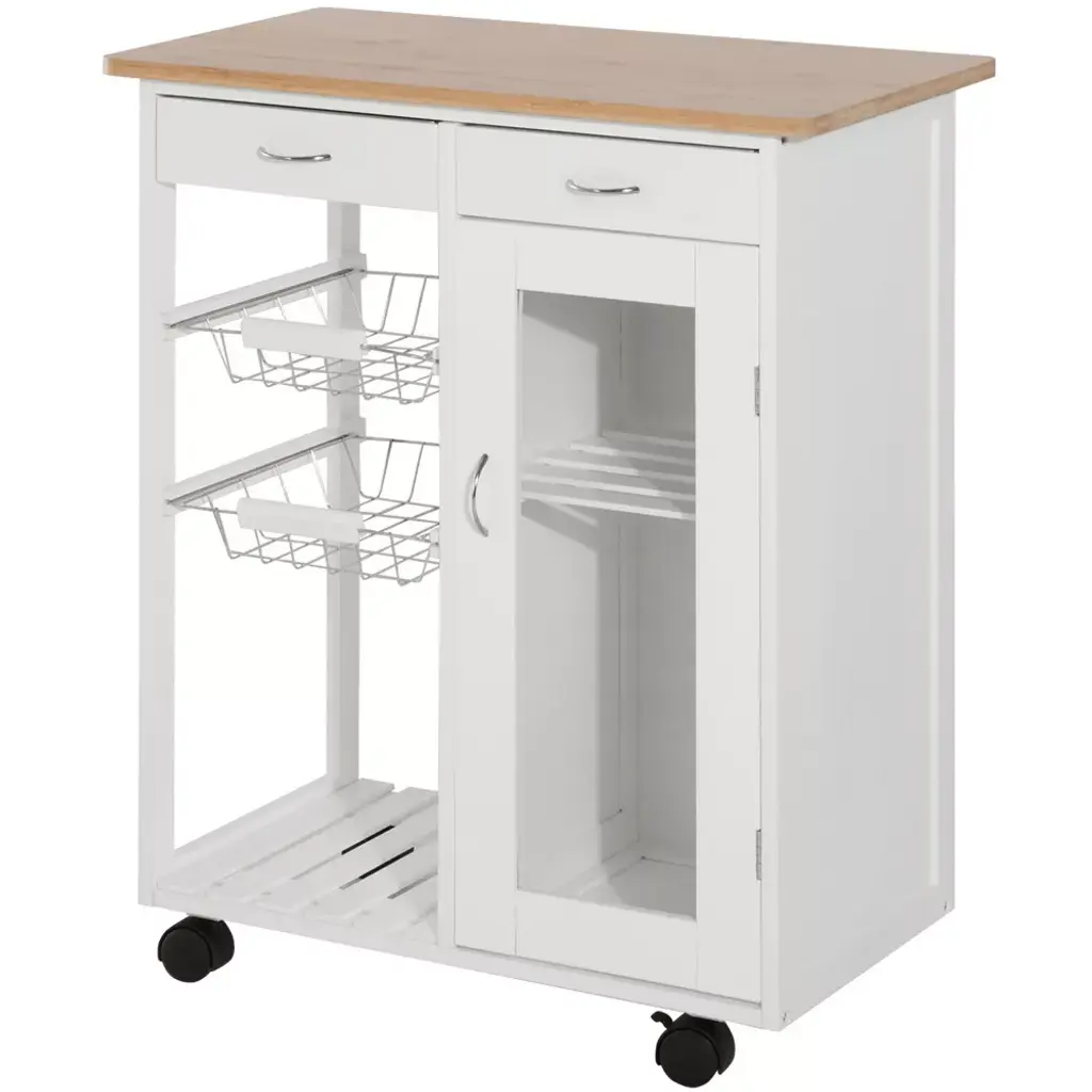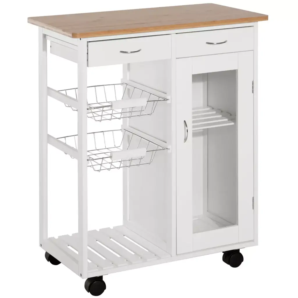 Homcom 28" Rolling Kitchen Trolley Serving Cart Storage Cabinet Bamboo Top With Wire Basket & Door Cabinet & Drawers, White