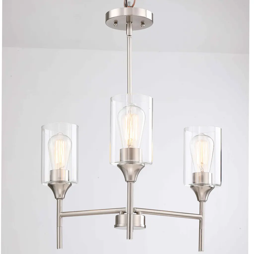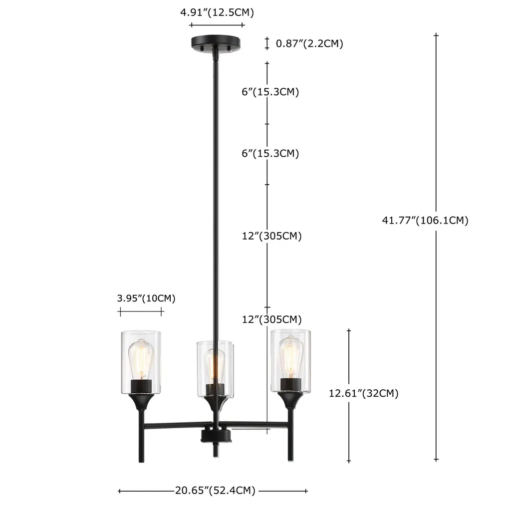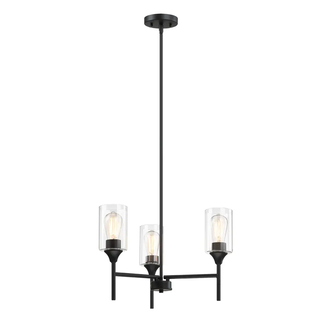 Brighten up your home with the elegant Hukoro 3-Light Chandelier. This fixture boasts a minimalist metal shade, perfect for a variety of rooms including the dining room, foyer, living room, bedroom, entrance, hallway, and kitchen. Utilizing 3 E26 bulbs, the chandelier's matte black finish and clear glass provide a warm modern-style glow. Glass shades with a matte black finish add an elegant touch, ideal for decorating entryways, hallways, dining rooms, foyers, kitchens, living rooms, and meeting rooms. Hang this beautifully crafted chandelier in any indoor space, perfect for a breakfast nook, above a kitchen island, over a dining room table, or in high-ceiling areas like foyers or entryways. Includes all mounting hardware and easy-to-follow assembly instructions for a hassle-free installation. 90 Days Limited Warranty Bulb Specification: Requires 3x E26/medium base, 60-Watt bulb; A or ST type bulbs are suitable (bulb not included). cETLus Listed: We guarantee the product is safe and fully functional to our consumer Plate Size:W:4.92"X H:0.87"